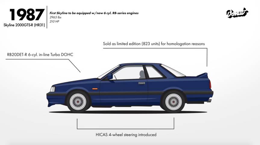 第七代Skyline可以说是在R30基础上的进化版本,拥有更大的车身和更加硬朗的外形,R31拥有轿车、跑车、旅行车几种版本,而GTS-R可以说是R31的终极版本,代号为HR31。HR31搭载的是RB20DET-R直列6缸DOHC涡轮增压发动机,拥有四轮转向功能。