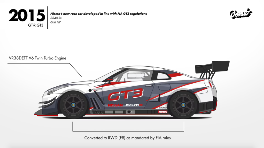 这部赛车搭载的是DOHC V6双涡轮增压发动机,采用前部中置布局,608马力/6500转每分,最大扭矩690牛·米/5000转每分。与普通版本GT-R有所不同,Nismo GT-R GT3采用了RWB后轮驱动的驱动方式,最高时速能达到350公里/小时。
