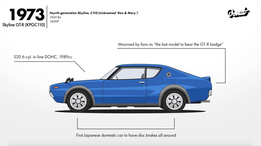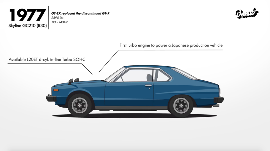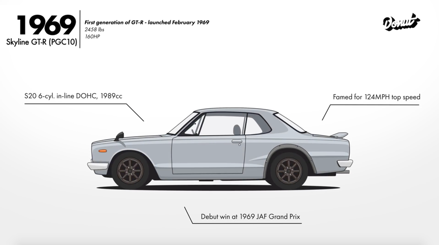 1969年2月代号为PGC-10的第一代Skyline GT-R诞生,它使用了一台2.0升(1998毫升)S20 I6发动机,这种新的DOHC发动机可以产生160马力的最大功率,与王子汽车的R380赛车使用的GR8发动机相似。