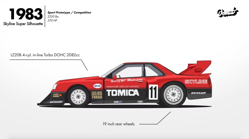 轻量化的Skyline赛车,车重仅为1007公斤,搭载2082毫升的直列4缸DOHC涡轮增压发动机,最大输出功率达到了570马力。