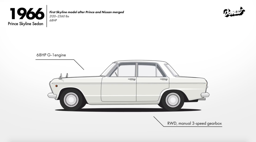 1966年Prince(王子自动车工业株式会社)因为经营不善,并入了当时还叫Datsun的日产。而这款车便是Prince并入日产后推出的首款Skyline,这台车搭载的是G-1发动机,最大输出功率68马力,后驱,匹配手动3速变速箱。