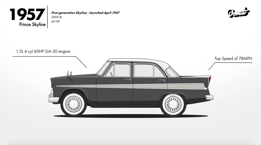 1957年4月24日,初代Skyline诞生于日本宝冢,它采用了1.5升(1482毫升) GA-30发动机(也被称为FG4A-30),最大功率60马力/4400转每分,最高车速为140公里/小时。当时的Skyline显然是受到了美国汽车的影响,外观与当时的雪佛兰极为相似,双色车身和巨大的镀铬尾翼是它最具标志性的设计(美国人的品味与中国惊人的相似)。