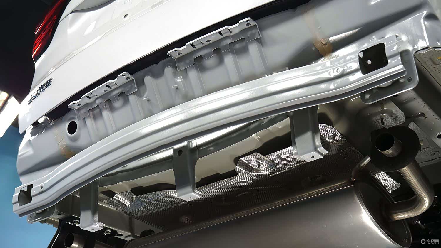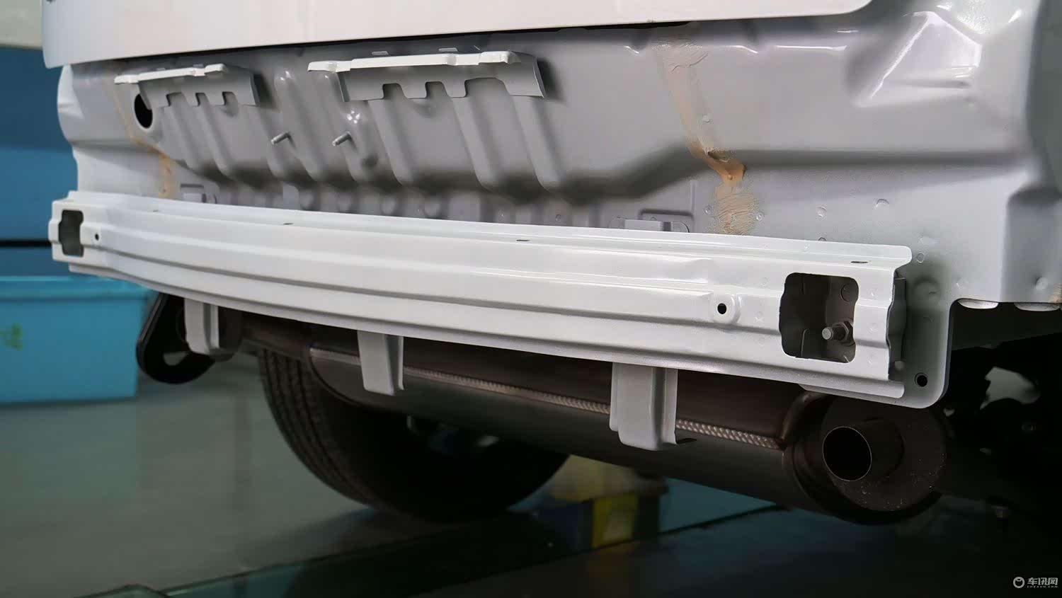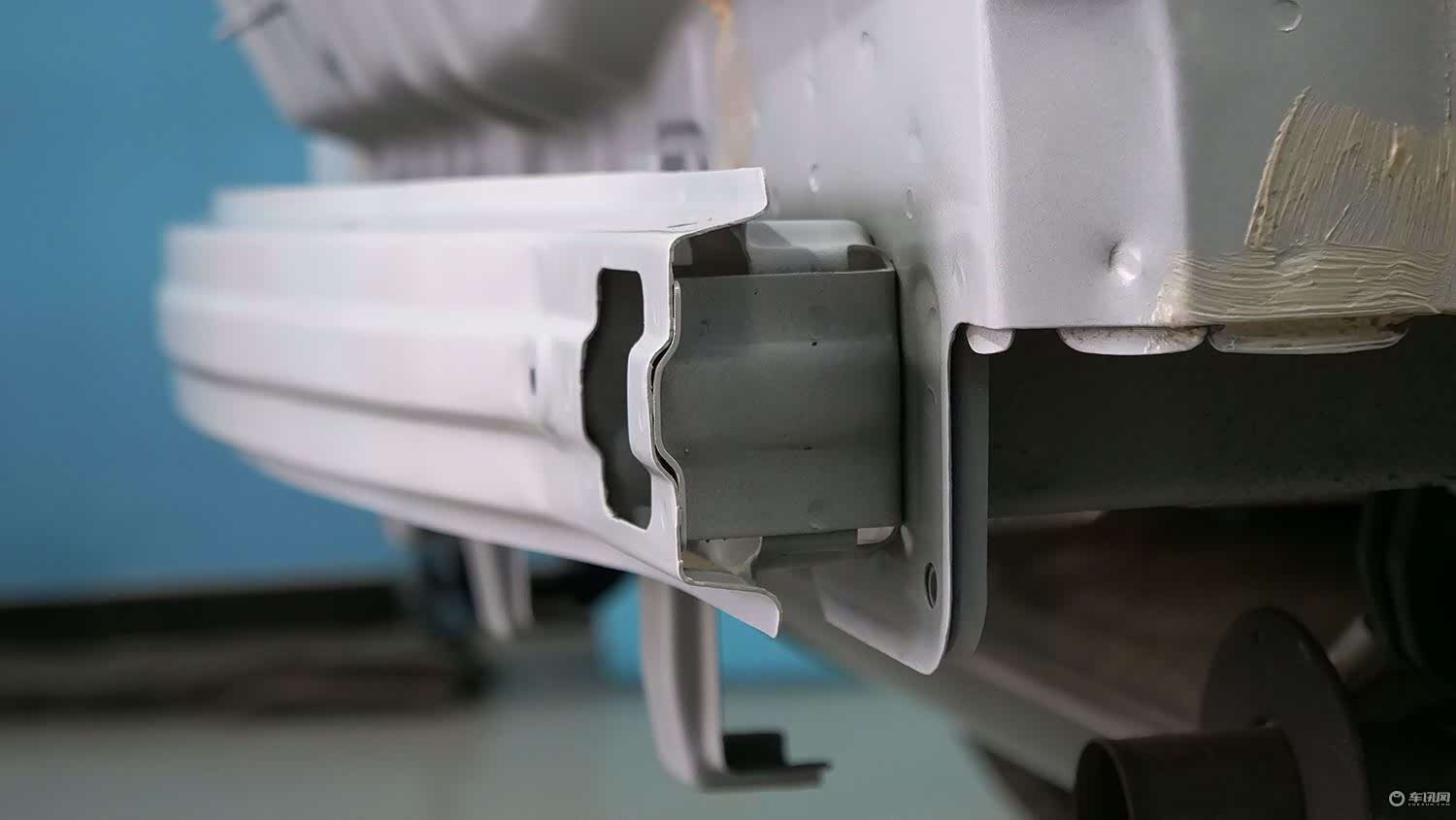 后防撞梁为单层钢板冲压而成,杠身另外冲压出凹槽以提高其强度,有利于分散更多碰撞能量到左右两侧安装支架。