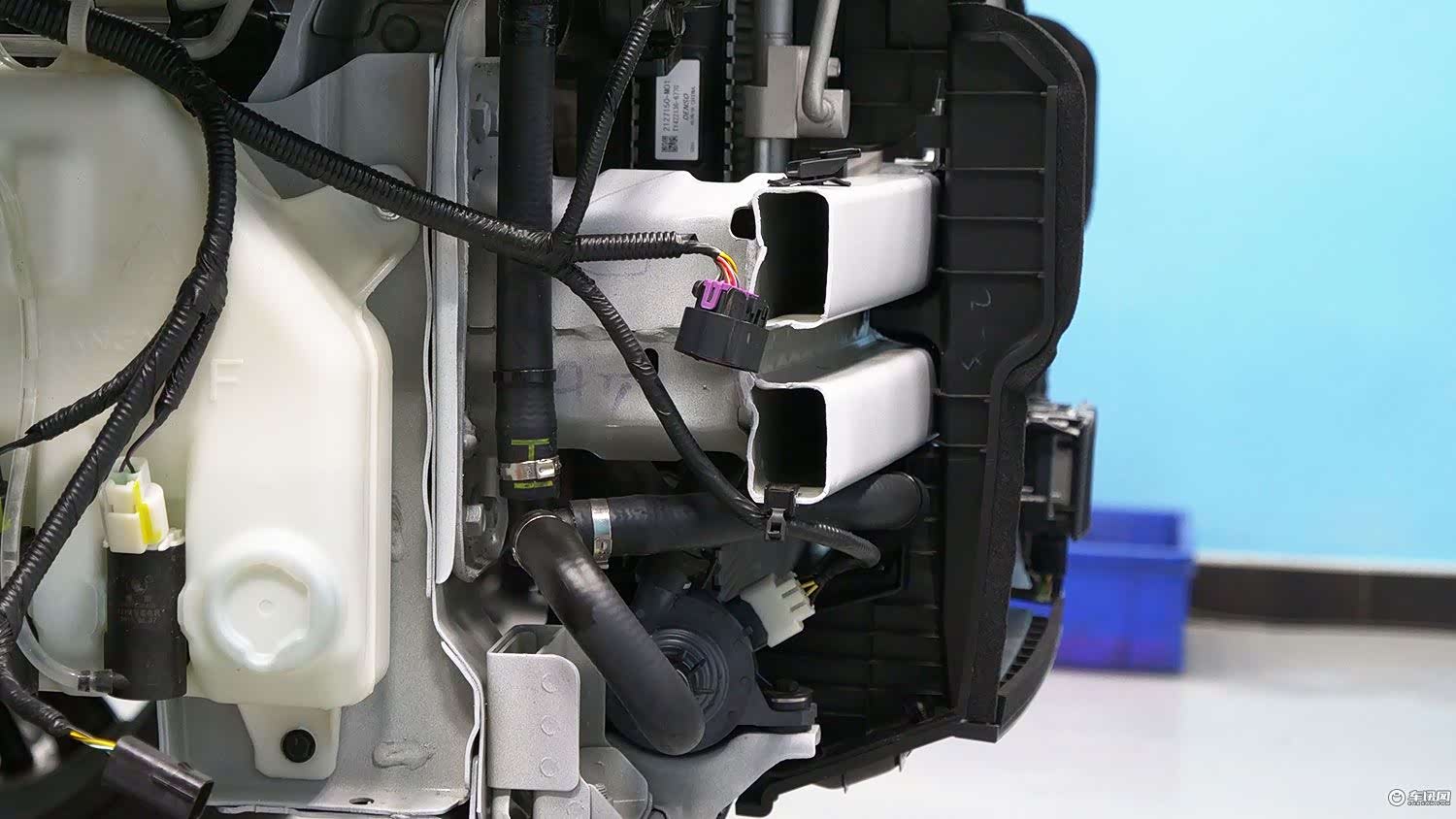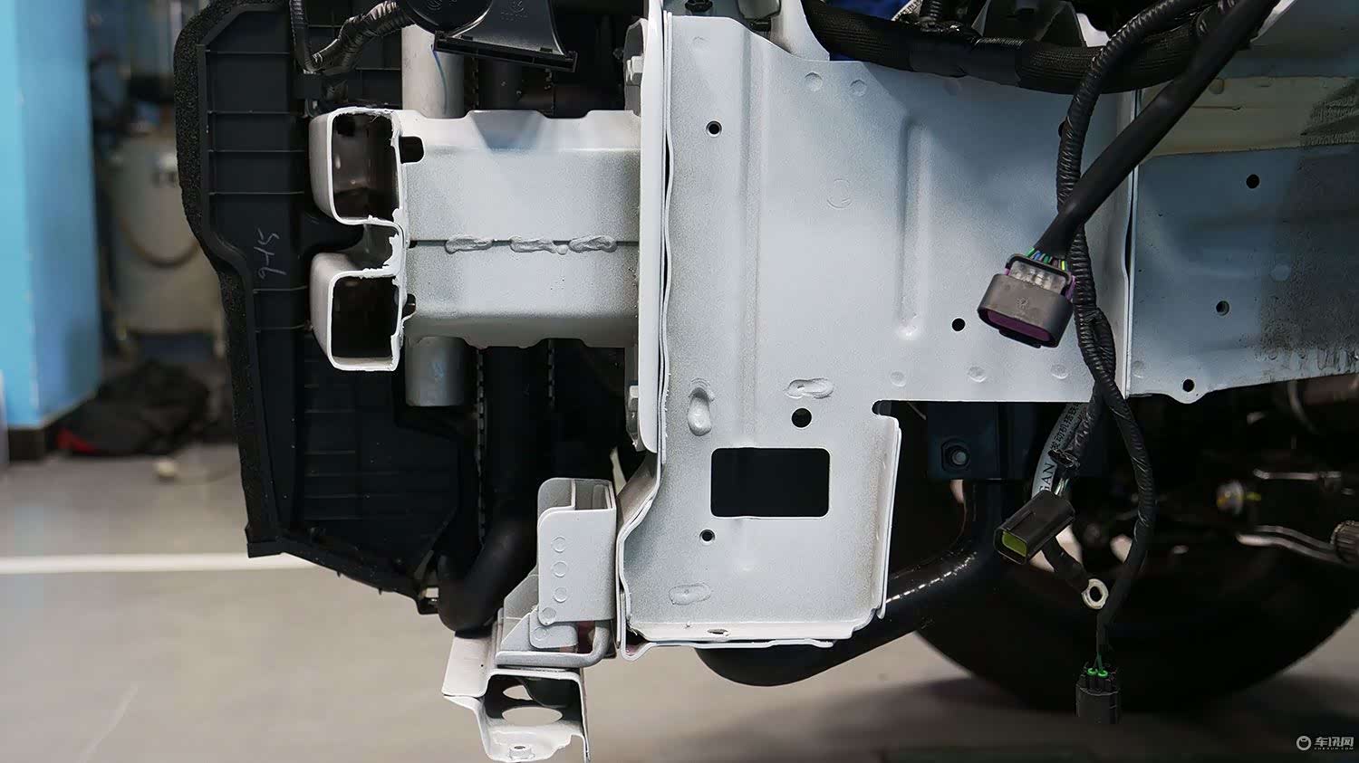 当车辆前部遭遇撞击时,上方的碰撞能量由“凹”字造型、闭合结构的金属材质前防撞梁接收下来,并迅速向左右两侧吸能盒传递。