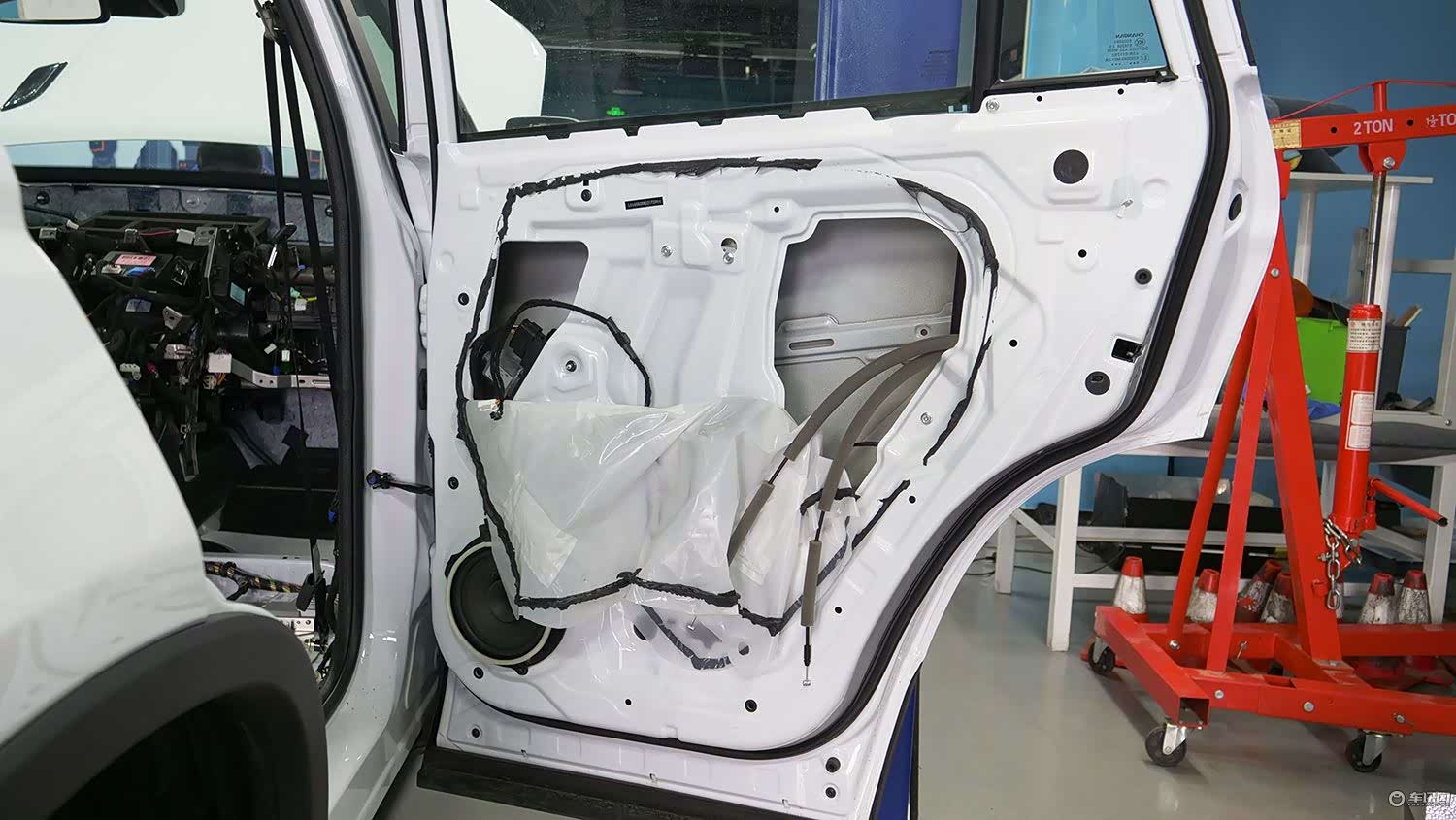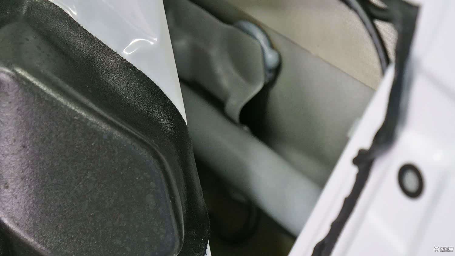 后车门内部管型防撞梁,其作用和前门防撞梁相同,后车门外皮内侧同样黏贴了止震贴。