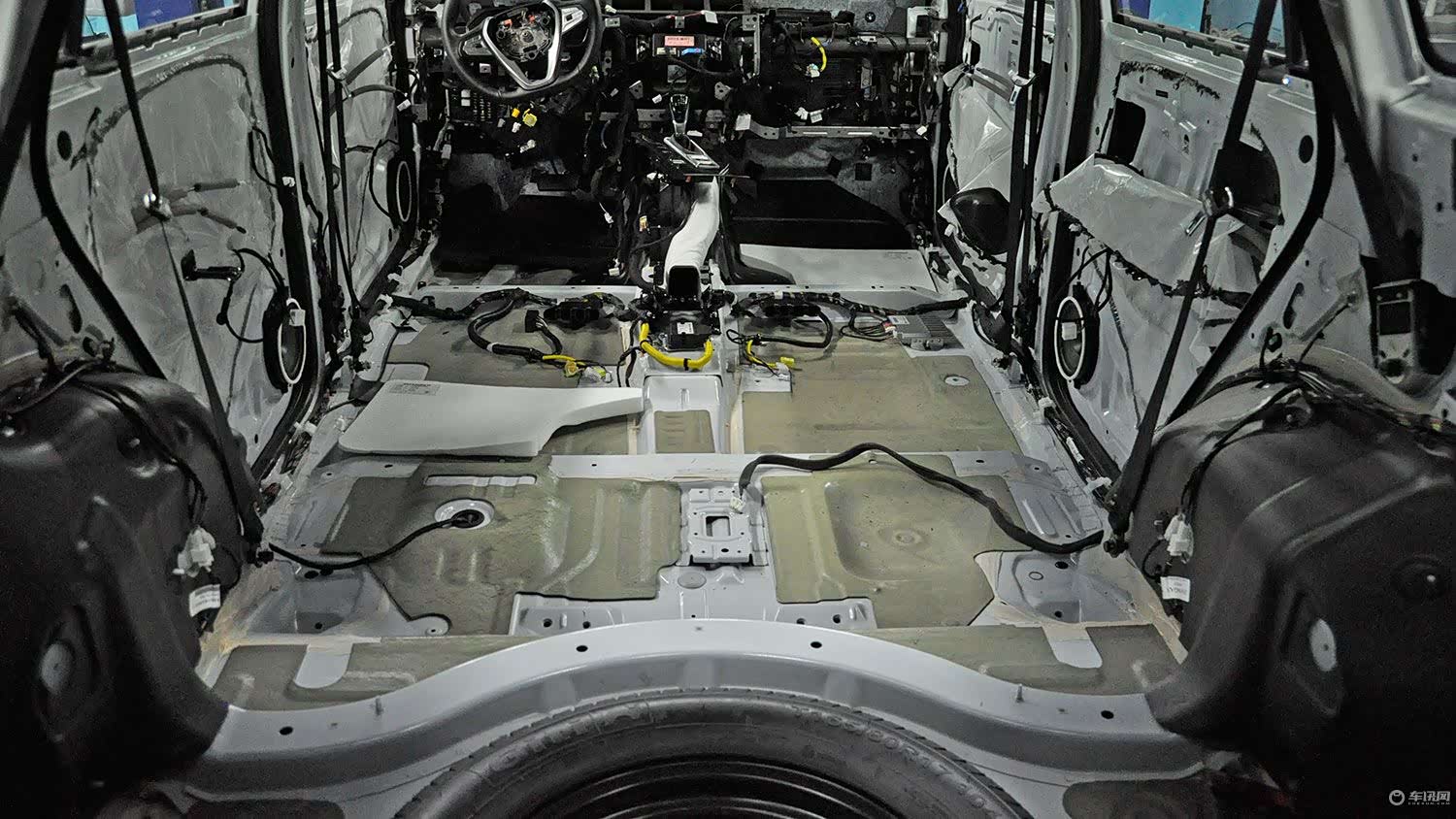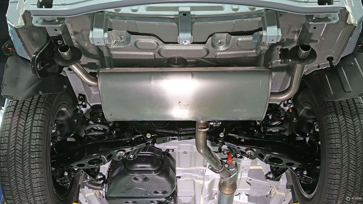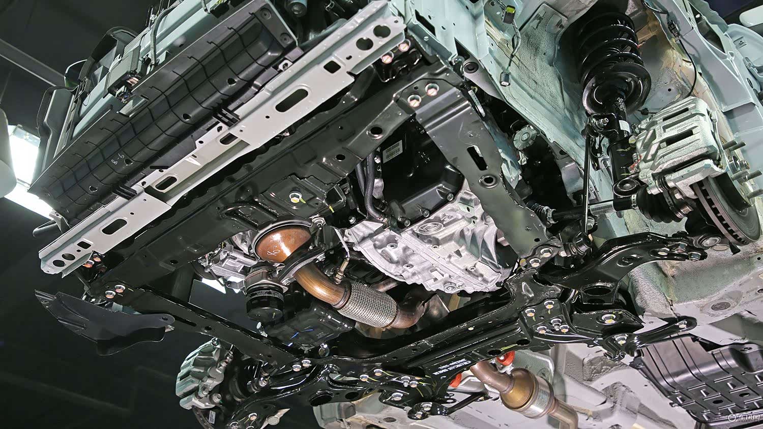 在乘员舱下方,如上图所示,我们能看到车身底板下方同样设置了纵横交错的框架结构,配合车身底板上方的贯穿式横梁,有效提升车身刚度和抗扭度,既有利于提升车辆操控感受,又有利于在遭遇撞击时分散和吸收碰撞能量,提升乘员舱安全保障。