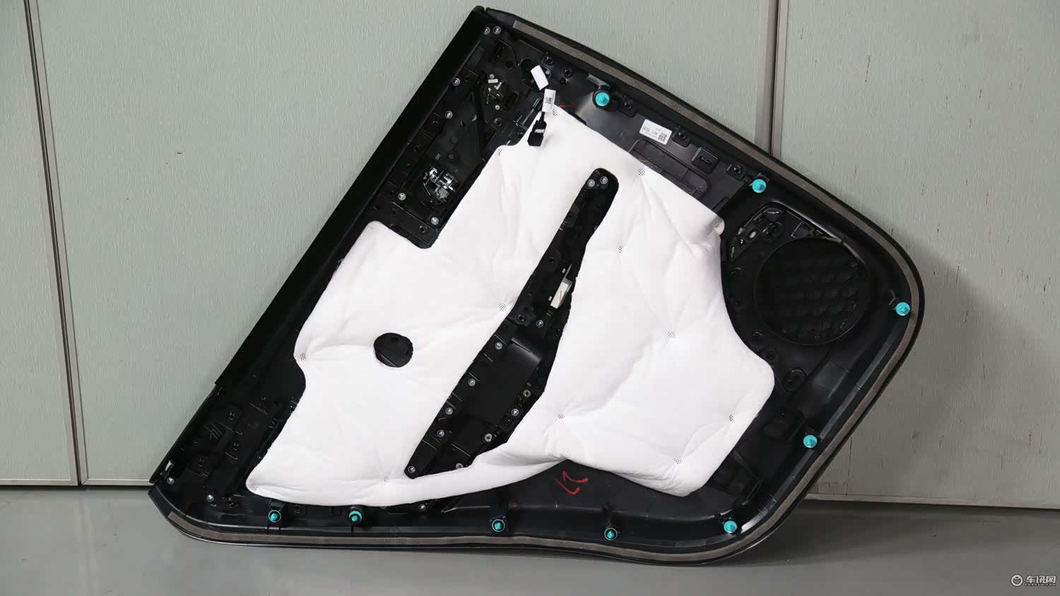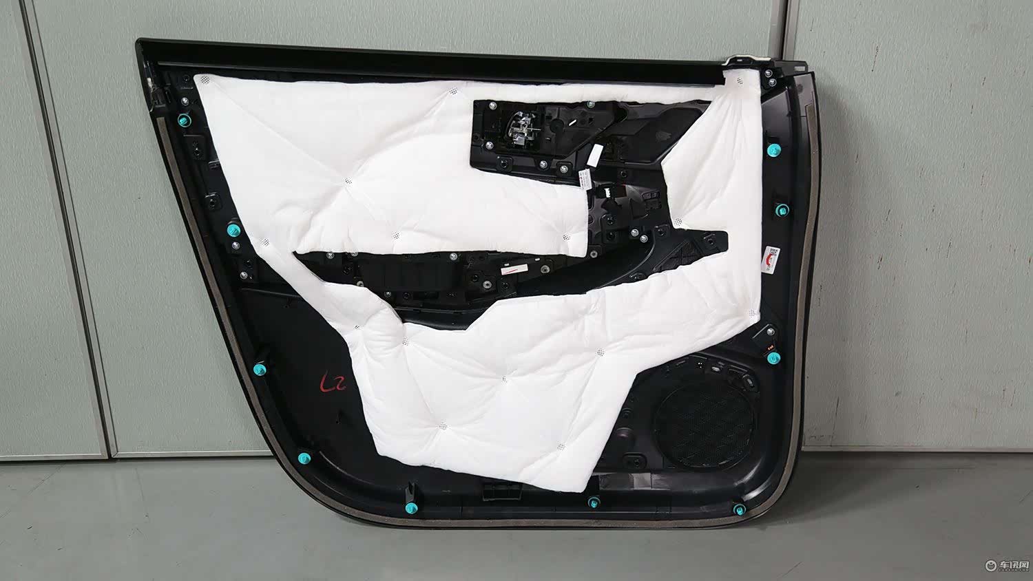 车门内衬板内部通常会设置吸音材料,来减少外界噪音的导入,提升车辆NVH性能,长安新CS75前后车门内衬板上设置了大面积原生材料白色衬棉。