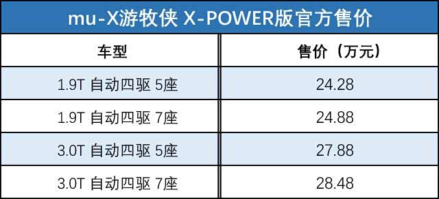 上周,江西五十铃正式推出了mu-X游牧侠X-POWER版车型,售价24.28-28.48万元。据官方介绍,mu-X游牧侠的X-POWER系列是由江西五十铃独立设计团队打造,为现阶段江西五十铃旗下车系中定位最高端的车型。基于mu-X游牧侠的设计,X-POWER版车型采用了陨石灰色专属哑光车漆,并在细节部分增加了许多点缀;而其真正凸显高端的,是其搭载的1.9T和3.0T发动机,在匹配上6挡手动或爱信6挡手自一体变速箱,以及分时四驱系统后,表现出的强悍实力。
