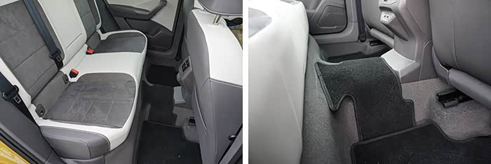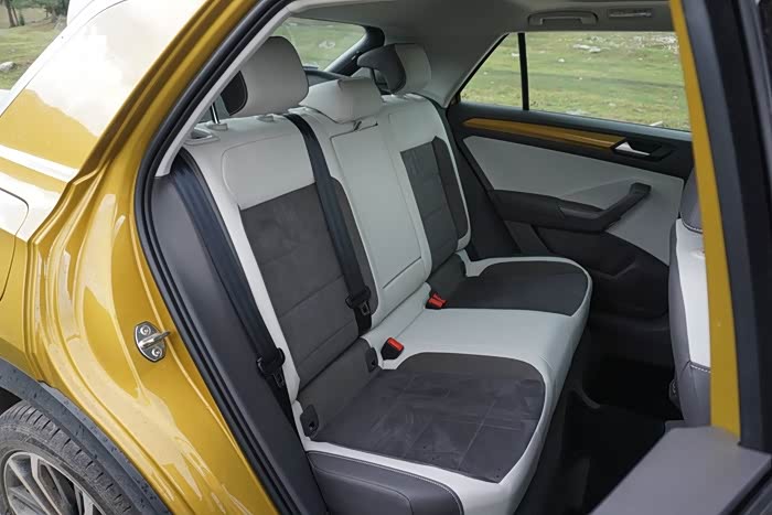T-ROC后排纵空间是越级的,膝部空间妥妥地超过两拳。而且即使前排座椅降到最低,后排乘客一样可以轻松将脚完全伸进前排底下,坐得更舒展。而且T-ROC也没有用偷短坐垫的方式来营造宽敞的错觉。后排坐垫长度属于主流水平,重点是整体上翘角度很到位,对大腿的支撑很好。要挑的话就是后排靠背,如果能再偏躺一点就更好了。