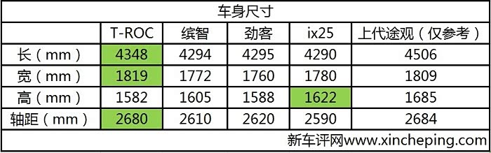 再说说尺寸。欧洲卖的标轴T-ROC,轴距只有2603mm,比高尔夫还短34mm。这样的体格想想都觉得很灵活,但无论是看那边标致308s的前车之鉴,还是大众一向的流程,一汽大众版T-ROC探歌都不可能不加长。加长77mm之后,T-ROC探歌的轴距已经和上代国产途观几乎一样,差异可以忽略不计。