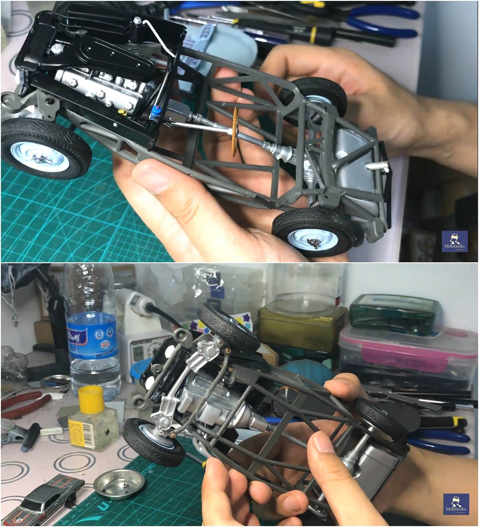 这一套管状车架也是由金属材质制作;行走部分带有避震行程功能;承载内饰的 “澡盆” 有细致的植绒;座椅为织物和皮革拼接组装;中控台仪表清晰可辨。另外,方向盘联动等功能也悉数呈现。