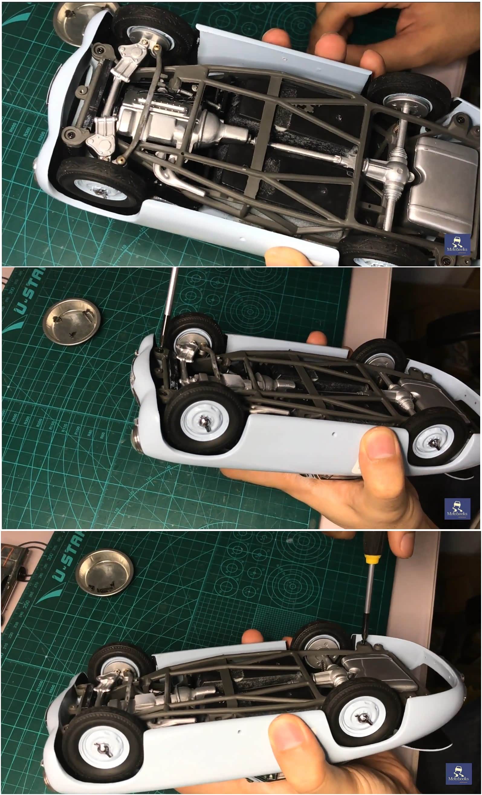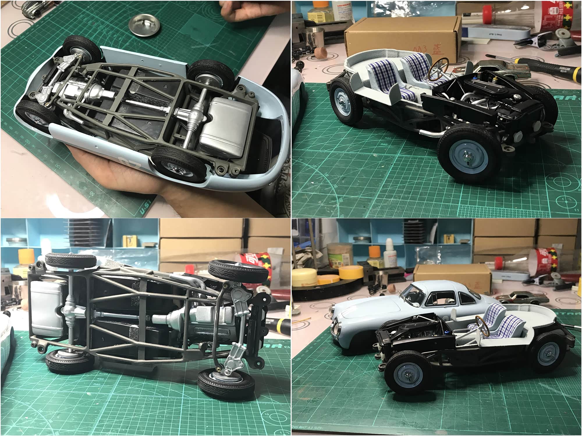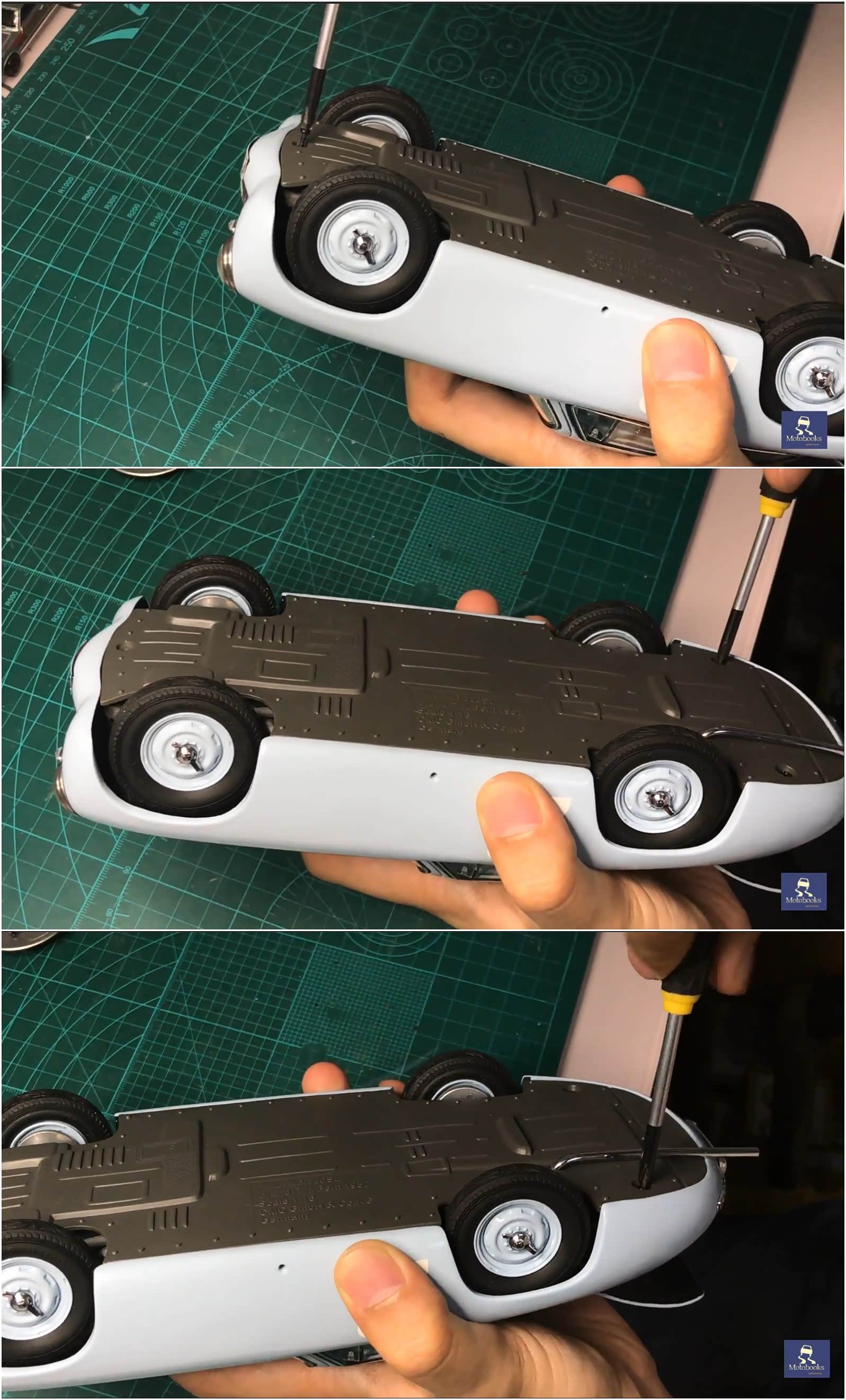 实在是太好拆了,没几分钟就能将模型分解成:底盘、车架、内饰和车体四个部分。本以为拆解一台 CMC 会很麻烦,但这显然并不会出现在奔驰 300SL 上。不过我们没有兴趣再进一步的解剖了,一是因为至此已经能目及大部分结构,二是到时候还要原路装回去,实在是懒 ... 想炫技的话就拆机械表了,还拆什么玩具车。
