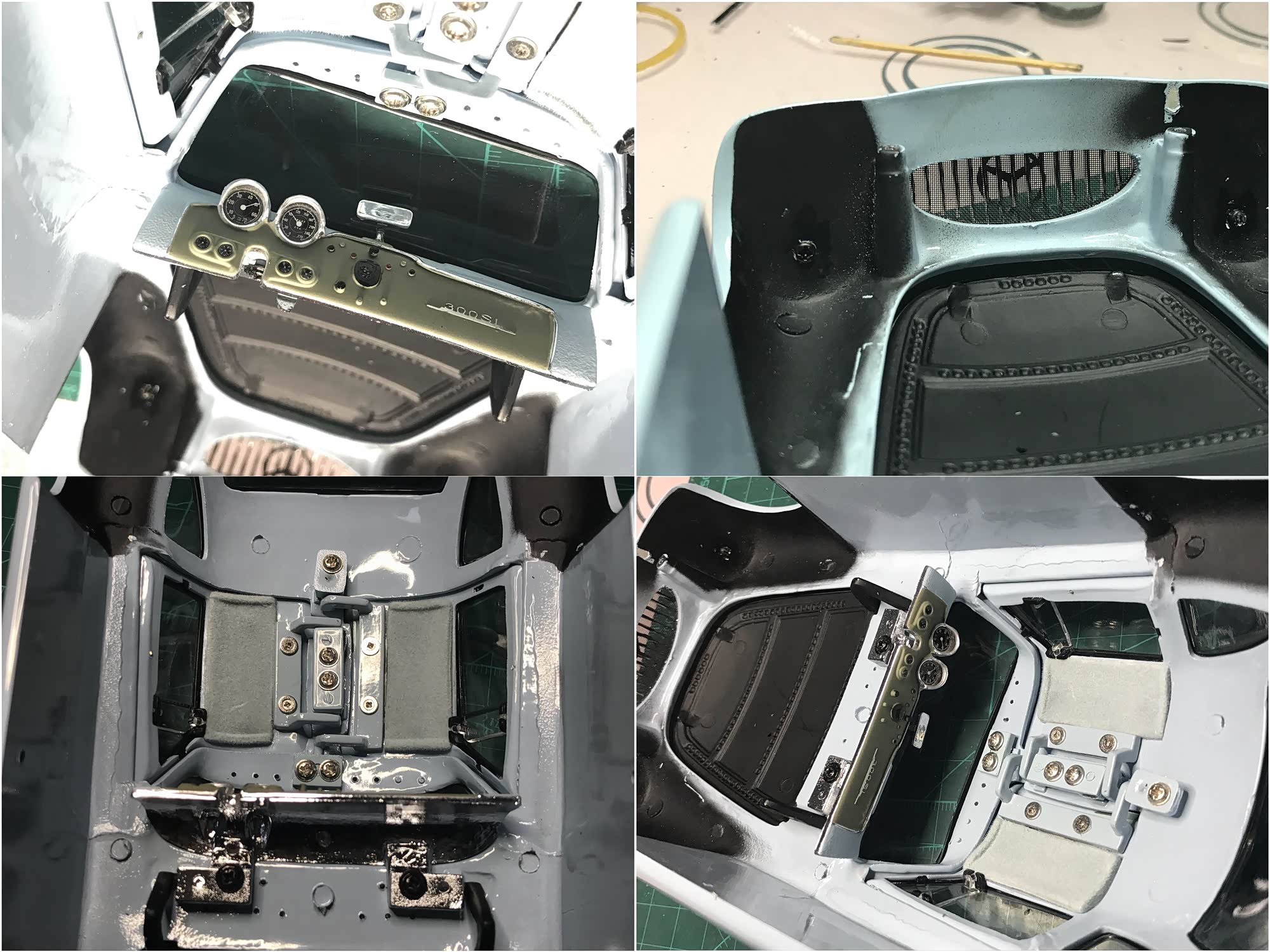 发动机部分为独立结构,但很明显能看出 CMC 老工艺的观感。尽管有各种管线以及分色加持,但相比其他题材模型车的发动机舱来说还是显得有些 “单薄”。另外,在各种地方都能看到残留胶水的 “白雾”,甚至还能清晰看到模型师的指纹 ... 不过用棉签就能擦掉。(说擦不掉的,请看完视频。)