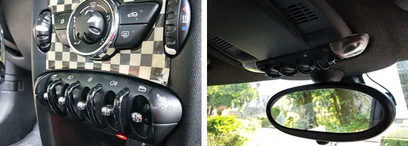 MINI的内饰可以说绝对是完全为了女生打造,同样和车身相同的红黑撞色之外,MINI最为标志性的就是中控台上类似于“米奇”造型的是鼠标+空调出风口搭配。另外在中控区域和车顶照明区域留下了相当多部分复古的拨杆是操作来调节电动车窗,车内照明灯等等等等等。