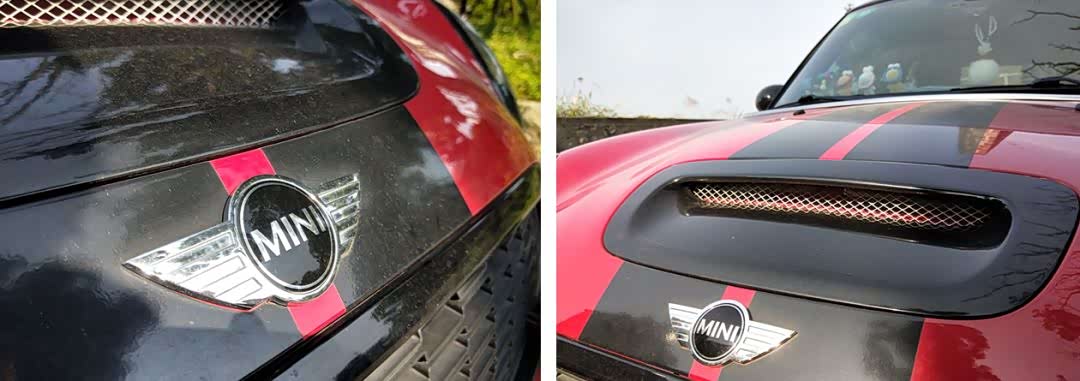 赛车条纹是前任厦门车主留下的,现任车主在MINI引擎盖前部加装了原厂的拉力灯(灵感来源于MINI参加拉力赛的时期),轮圈的部分以及车身高度为了不打破原车平衡,小點同学还是保留了原汁原味没有改装。