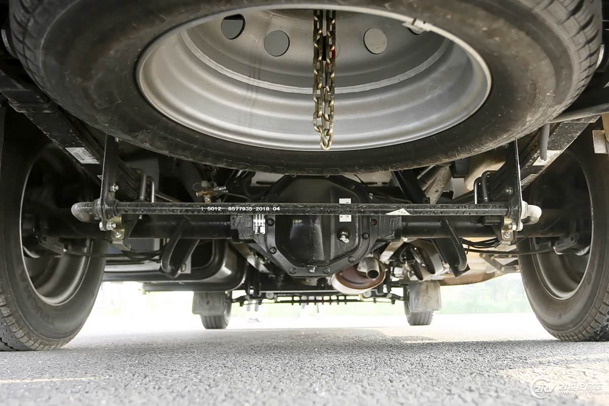 从底盘处观察,这台铁程房车采用了后驱传动行驶,前悬架采用扭杆弹簧独立悬架,后悬架为钢板弹簧非独立悬架。