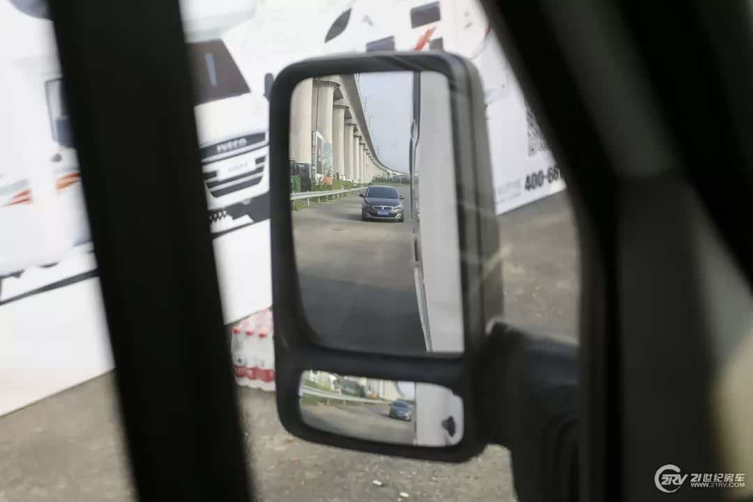 由于C型房车在底盘上安装有生活区箱体结构,所以对于驾驶室的外后视镜也进行了加宽处理,保证驾驶员更宽阔的视野,同时后视镜还采用了双区后视镜,进一步减小视野盲区。