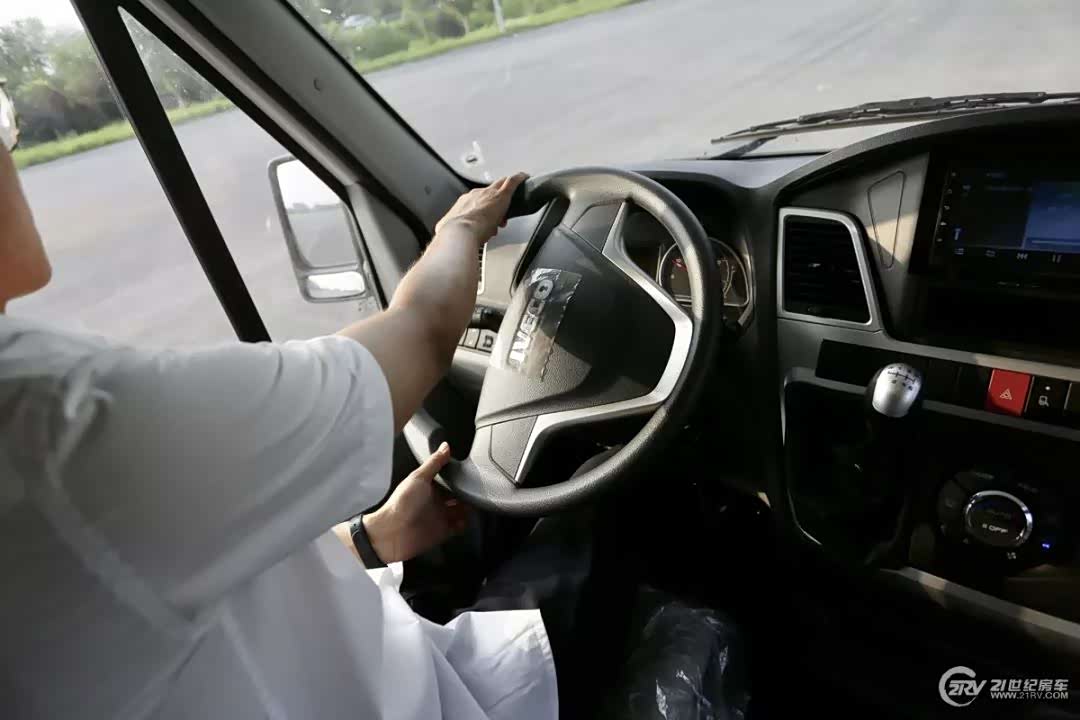 接下来就是大家最为期待的实际驾驶环节,坐上驾驶位能够明显感到这台铁程房车的坐姿较高,优点就是驾驶员拥有更好的视野,一般的家用轿车或SUV都很难挡住我们的视线,对前方车况可以说是一览无余。加上依维柯宝迪底盘较短的发动机舱,坐在驾驶位上车身前方几乎没有盲区。