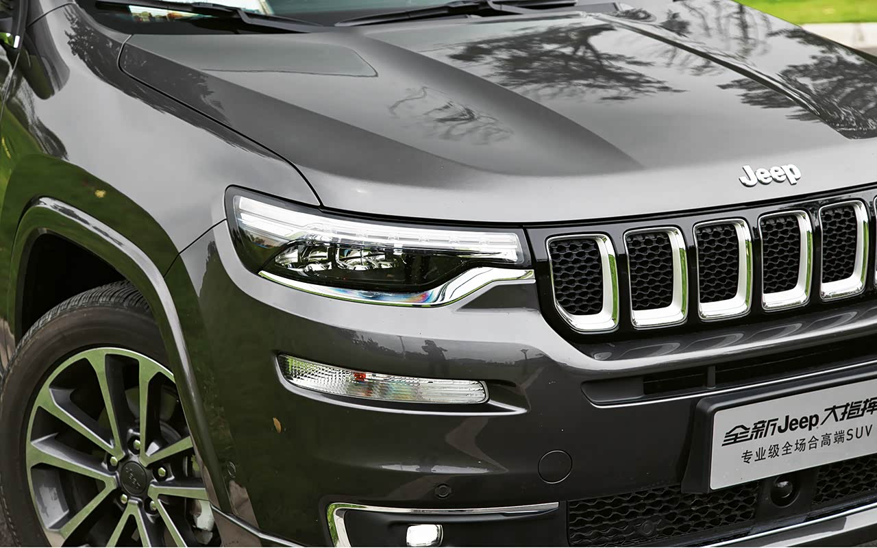 即便是从远处驶来,大指挥官标志性的7孔进气格栅能让人一眼就能认出这是一台Jeep车型。银色格栅的装饰件在造型上很自然的与LED大灯融为一体,在视觉效果上为大指挥官增添了几分精致感。有棱有角的Jeep风格配合位置较高的机盖,凸显大指挥官在车头部分的简洁大气。