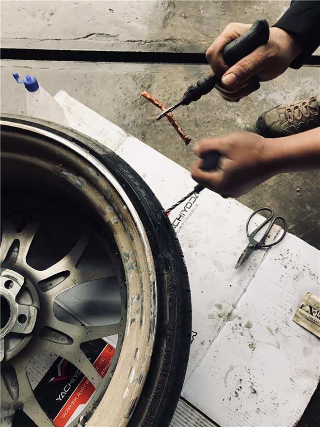 由于店家对大轮毂及薄胎壁处理起来没什么经验,所以花费了较长的时间。而在再次上路行驶了140公里后,由于胶未干透,又因下雨有水渗入,所以再一次出现漏气的现象,再一次停靠服务区紧急处理,而后再次上路。最终,在当地时间凌晨1点到达了北榄坡。
