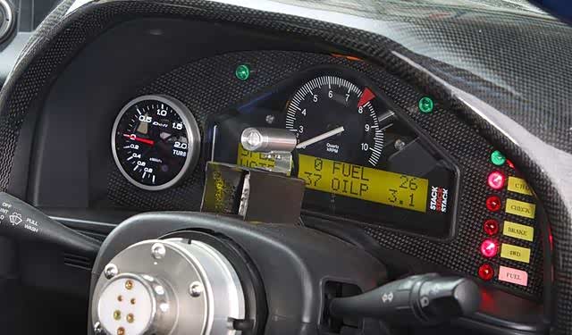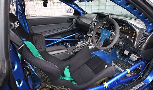 由于作为一辆超高性能的改装车,偏向的是竞速风格,而非是奢华舒适风格,内饰可以说简陋到了极致, Sparco赛车方向盘, Recaro SP -A芳纶座椅,高田安全带可以称得上是与舒适相关的设备之外,其他都是为了竞速而设的装备,防护车手人身安全的防滚架,为了减轻重量的碳纤维仪表板盖,剩下的就全部都是监控设备比如:DEFI仪表板,DEFI控制单元-II ,AF -700 Å / F仪表,E- TS HKS电子阀定时控制器,HKS EVC5升压控制器,HKS回路计数器,HKS混合控制器等等。众多的电子设备不但令人眼花缭乱,但是更多的就是兴奋了,能够驾驶这头猛兽在赛道上尽情咆哮的快感,享受神挡杀神,佛挡灭佛的快感!