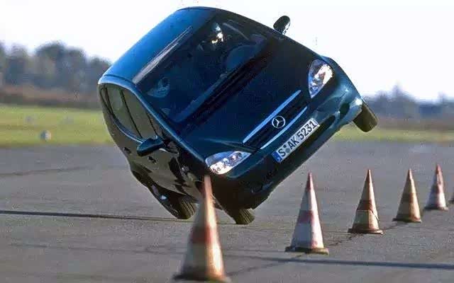 谈及麋鹿测试,那么第一代的奔驰A级大抵是逃不过去的。出于安全设计的三明治车身将第一代A级的重心抬升过高,导致瑞典汽车技术杂志的编辑在测试时发生了翻车事故。