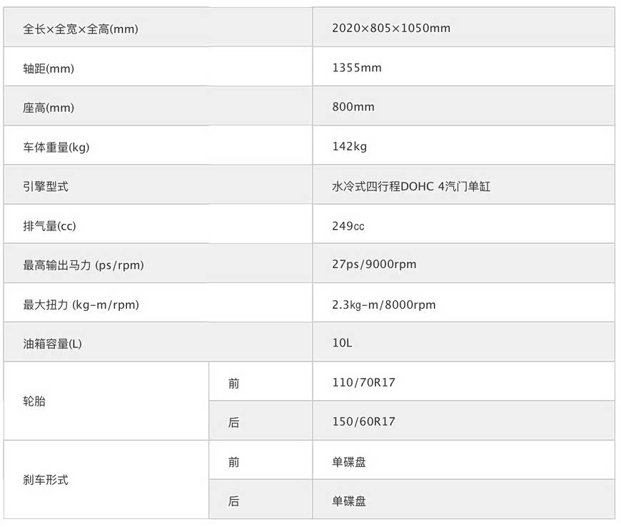 新款CB250R可以说是搭载水冷式DOHC 4气门249cc单缸引擎的CB250F的后继车款,因为引擎规格从压缩比、1/2次减速比到变速齿比等全部都和CB250F相同,但CB250R的最大马力却减少了2ps的下修为27ps。