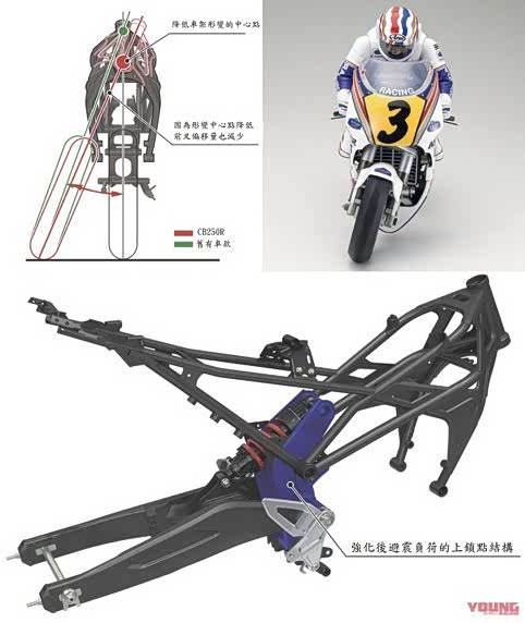 ▲关于转向安定感和车架形变之间的关系,在这边以遥控模型“Hanging on Racer”S.D.S.S.= Semi Direct Steering Systems为例子,这个概念与CB250R的车架形变十分类似,CB250R容易操控的重点应该就是因为在抑制左右形变的同时减少前叉角度,车架也采用与KAWASAKI推出的Ninja 250类似的钢管编织结构,借此达到轻量化。