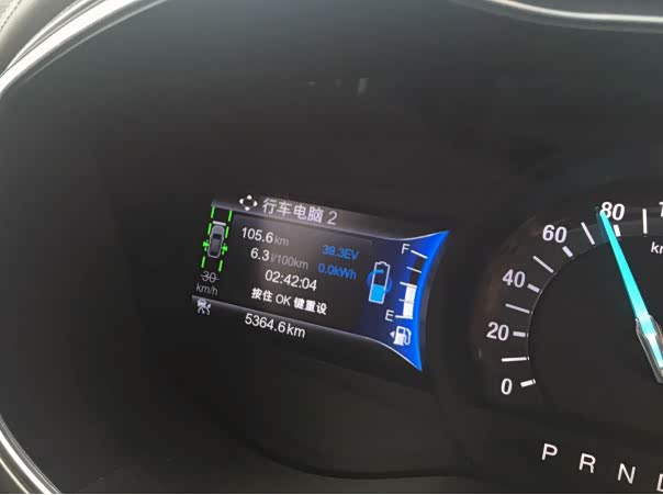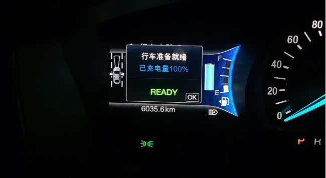 充满电量,当前续航里程表显示6035.6KM 电量全部用完,当前续航里程表显示为6070.3KM。实测蒙迪欧纯电动模式下,可续航35KM左右。