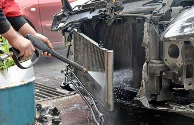 我们常说的水箱清洗指的是对水箱散热器外部进行清洗,在清洗水箱散热器之前要去除其表面的树叶等杂物,之后再用水枪清洗。清洗的过程中一定要注意不要使用水枪直流直接冲洗,那样水枪的力度太大,而散热器一般都是铝制,很容易损坏,所以我们要用水枪的扇面对散热器进行冲洗。