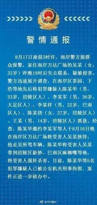 8月16日晚间,被害人吴某在南岸区万达广场停车场取车时被5名歹徒抢车后劫持上车。犯罪嫌疑人陈某华等将受害人吴某带到涪陵区,并将受害人强奸后杀害。五名参与犯罪的嫌疑人已经全部被抓获,其中一人年仅14岁。