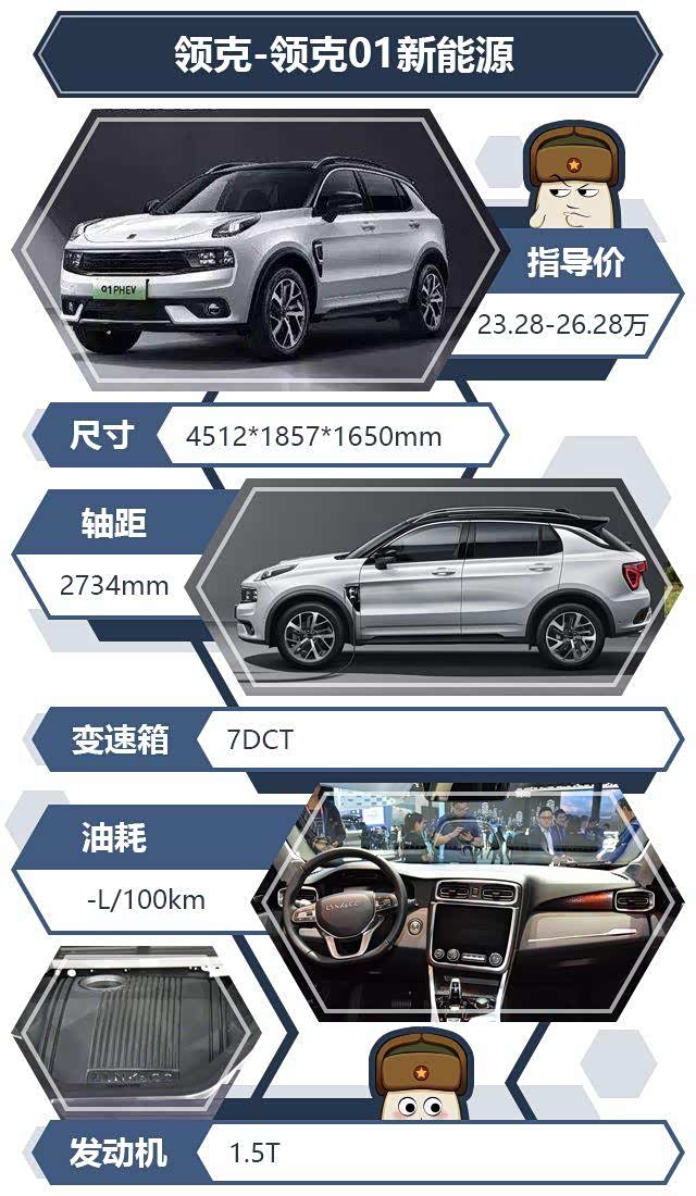 领克01 PHEV基于CMA模块化平台打造,其外观基本与汽油版车型一致,仅在部分细节上有所不同。新车采用的是CMA架构下的插电式混动动力总成,1.5T直列三缸发动机与电机共同组成动力系统,综合最大功率可达256马力。官方表示,新车的综合最大续航里程可达992km,纯电动续航里程为51km,百公里加速时间7.3s,综合油耗为1.7L/100km。
