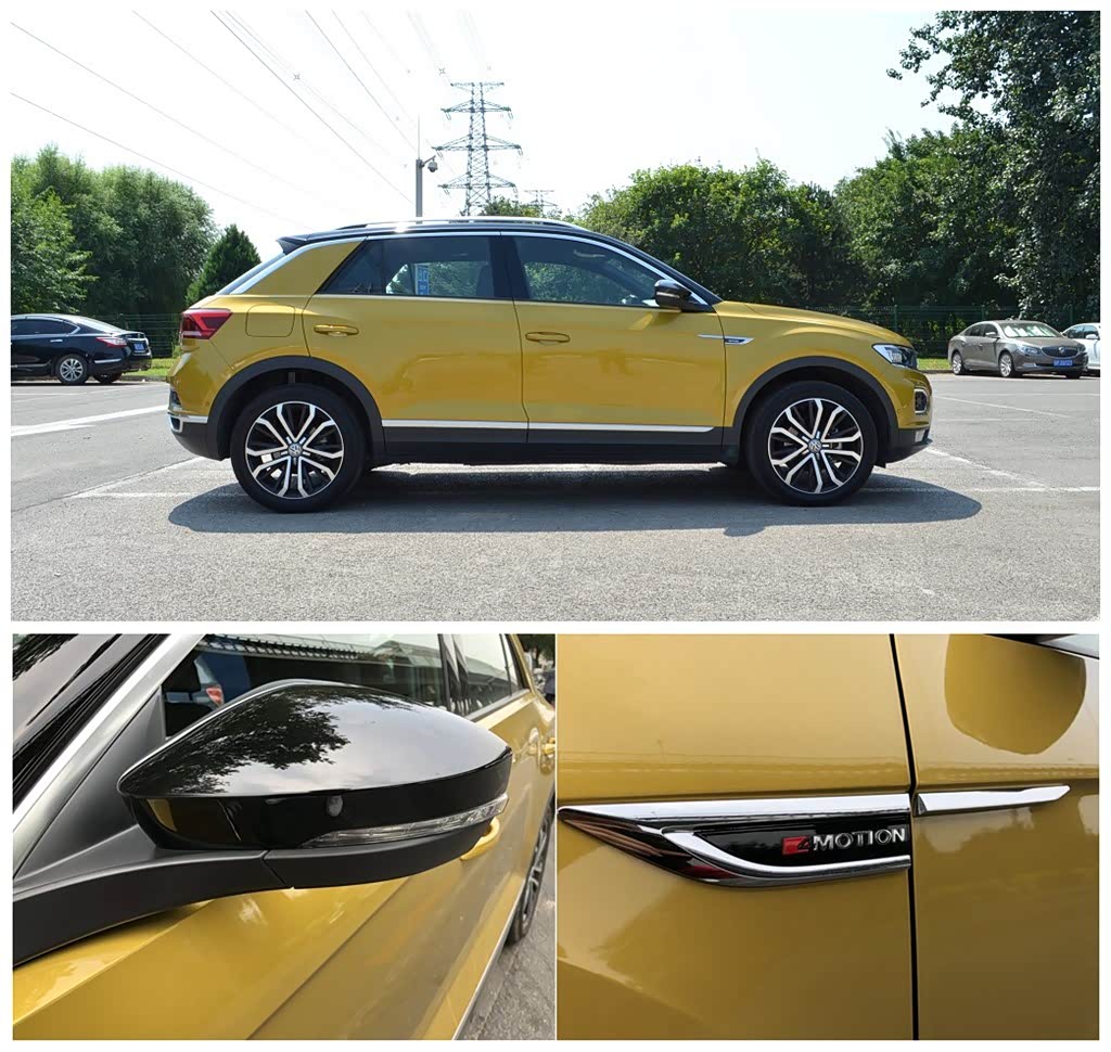 车身侧面线条硬朗、短小紧凑,并采用双色拼接式设计,A、B柱以及车顶采用了熏黑处理,并在末端延伸出一个「鸭嘴式」小尾翼的造型,配合着前后轮拱向外突出的设计,为整个车身营造了非常浓厚的运动气息,力量感十足。车顶还原厂配备了不仅美观还非常实用的车顶行李架,并在车窗上方及车身下沿运用了大量的镀铬饰条来增加质感,四驱版车型还在两侧翼子板处标有4MOTION字样来彰显身份。