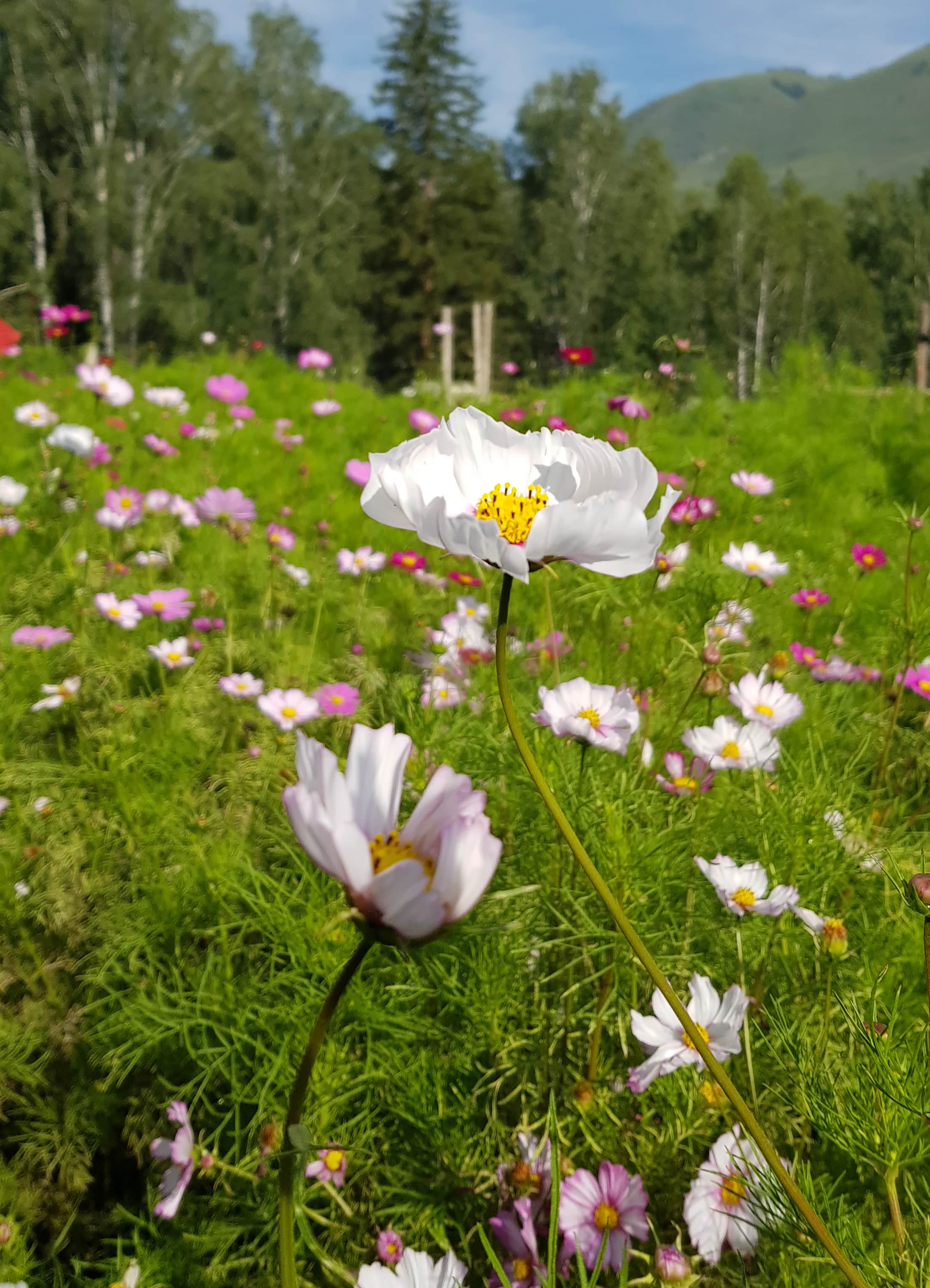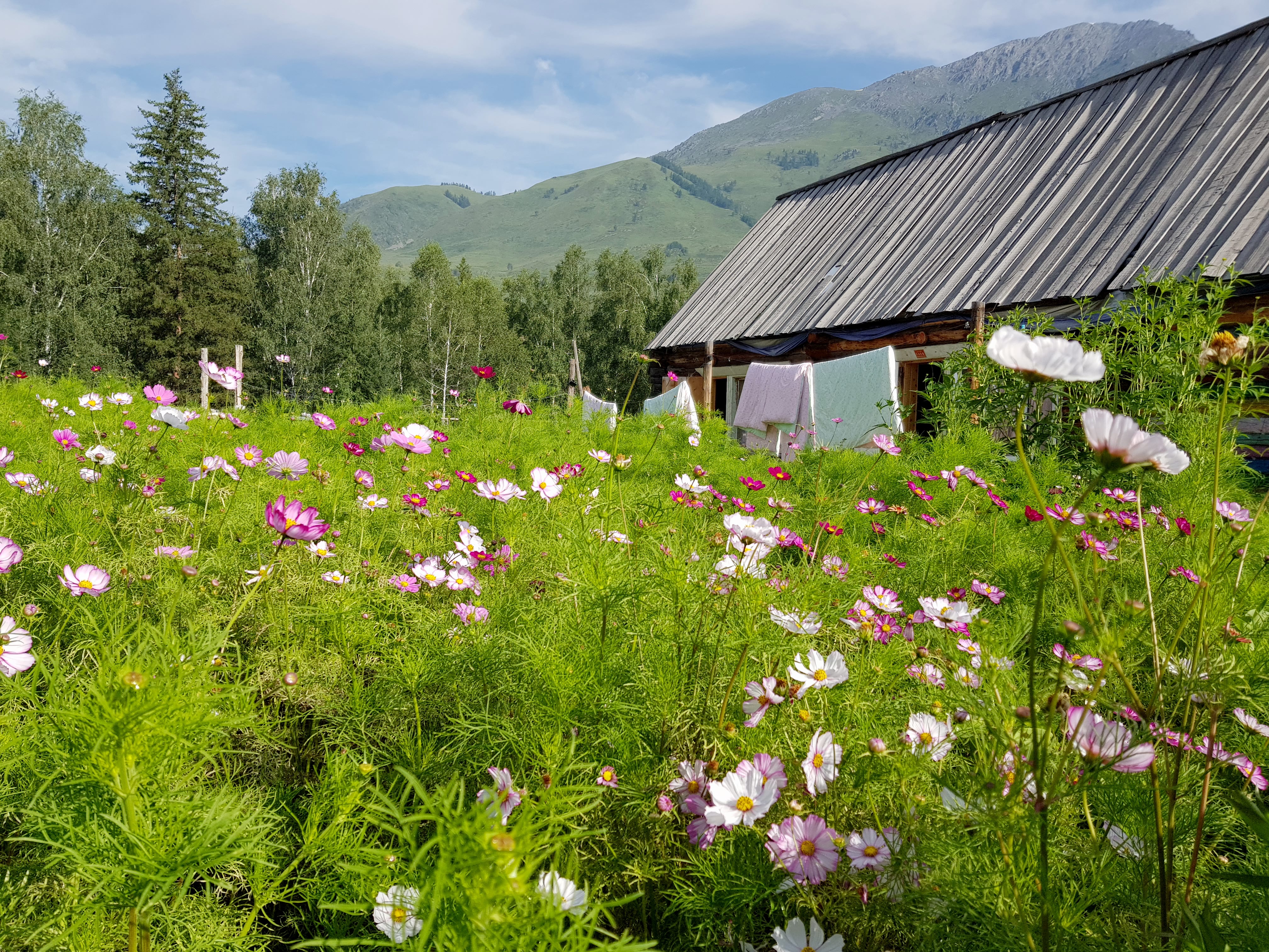 天气非常好拍完旅游照,回到小木屋,院子里格桑花特别漂亮~