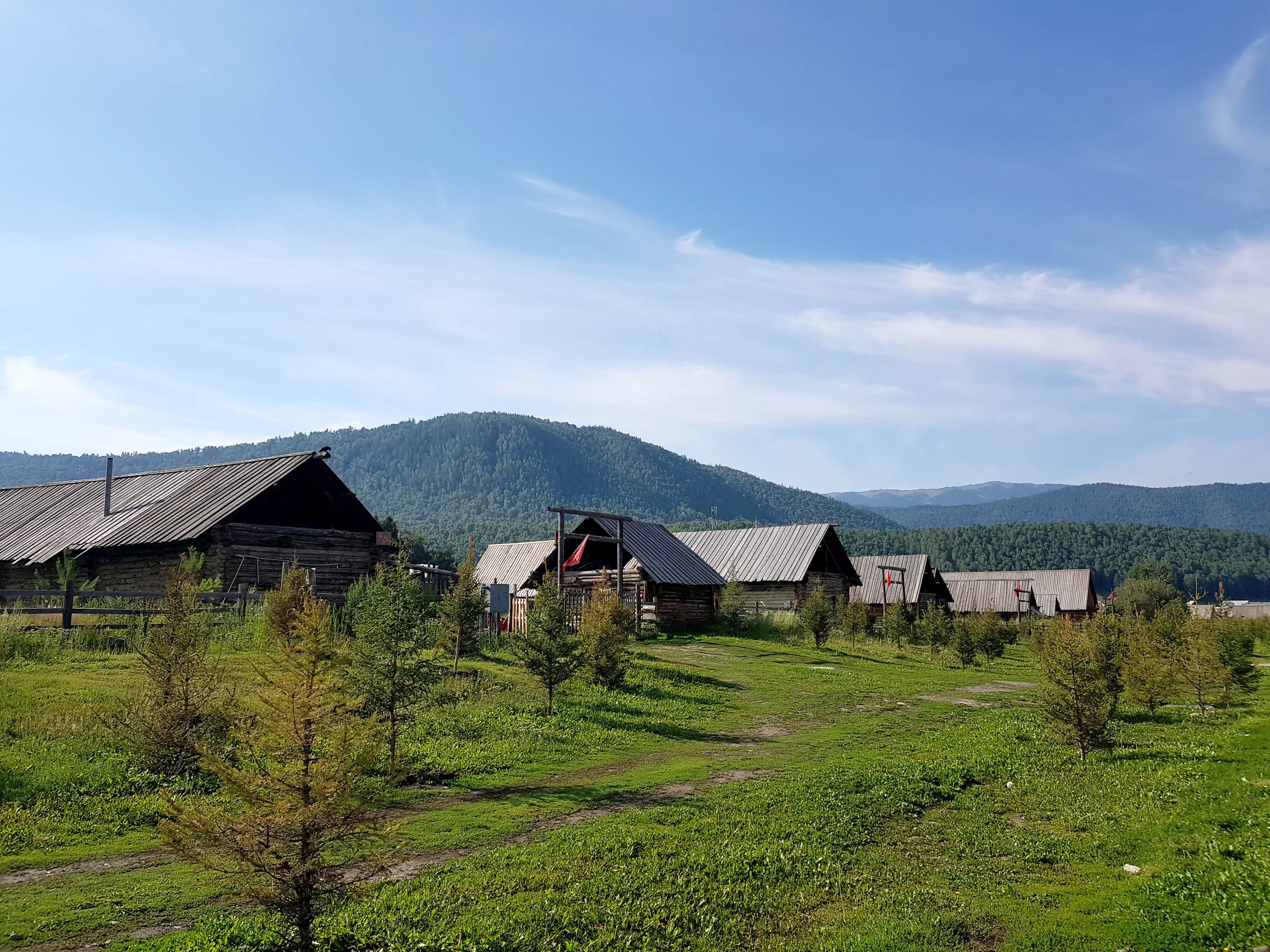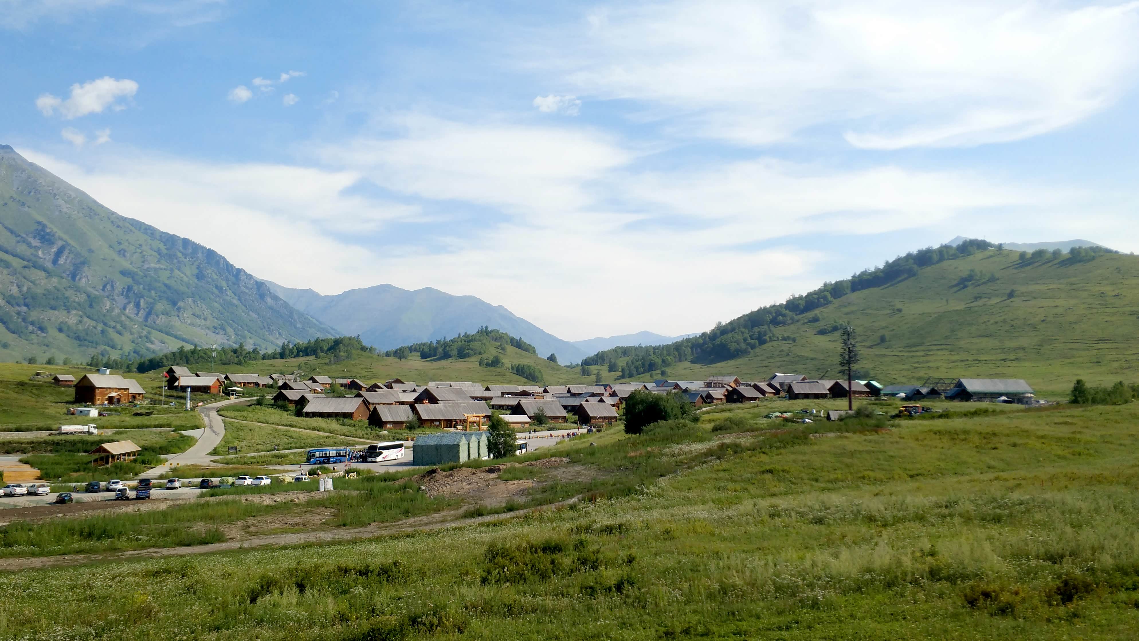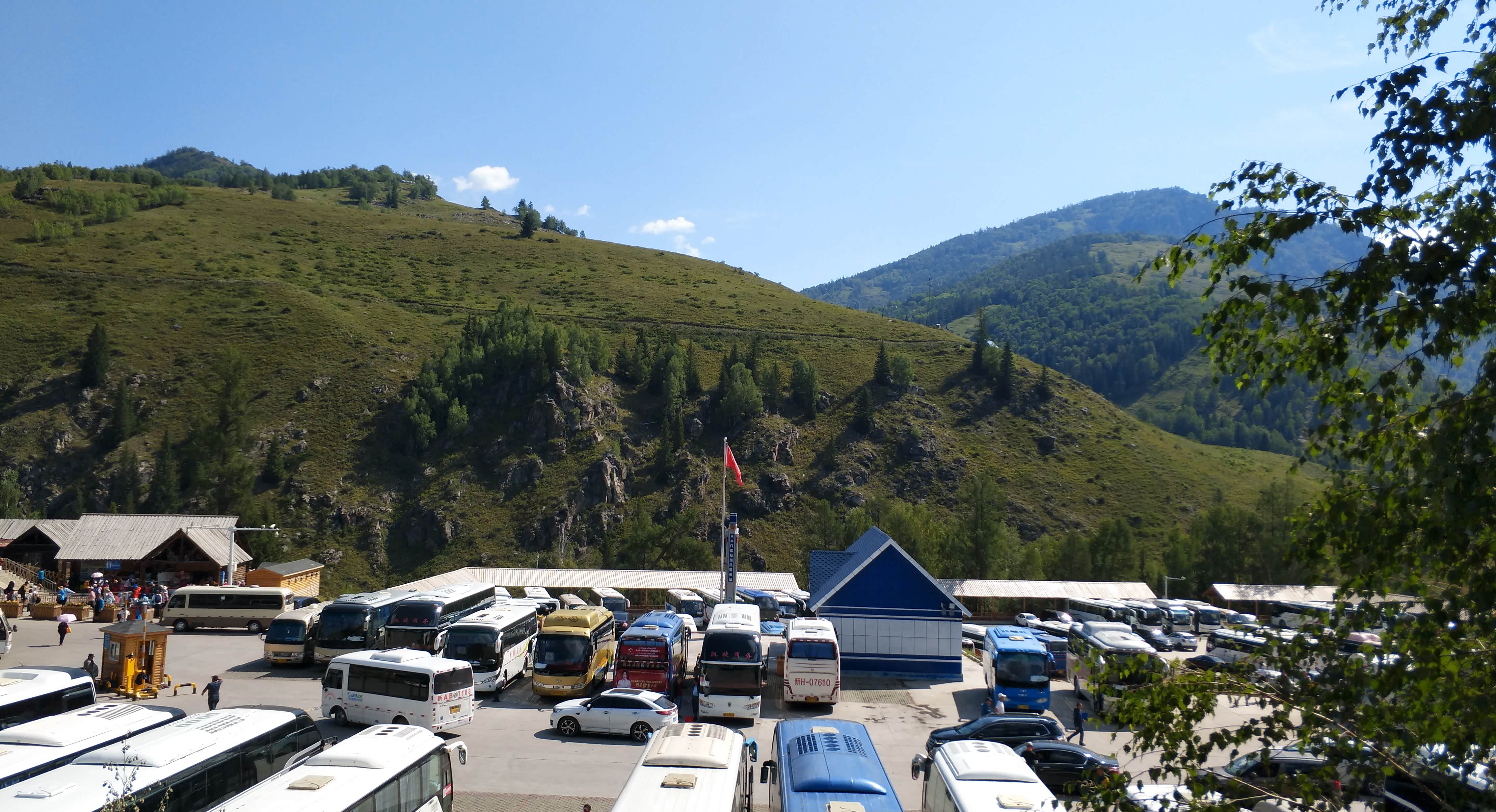 喀纳斯国家地质公园大门一个小时车程后,到达换乘中心,再转乘公交车到新村2号站,今晚的住宿位置,喀纳斯景区的住宿依旧是小木屋。