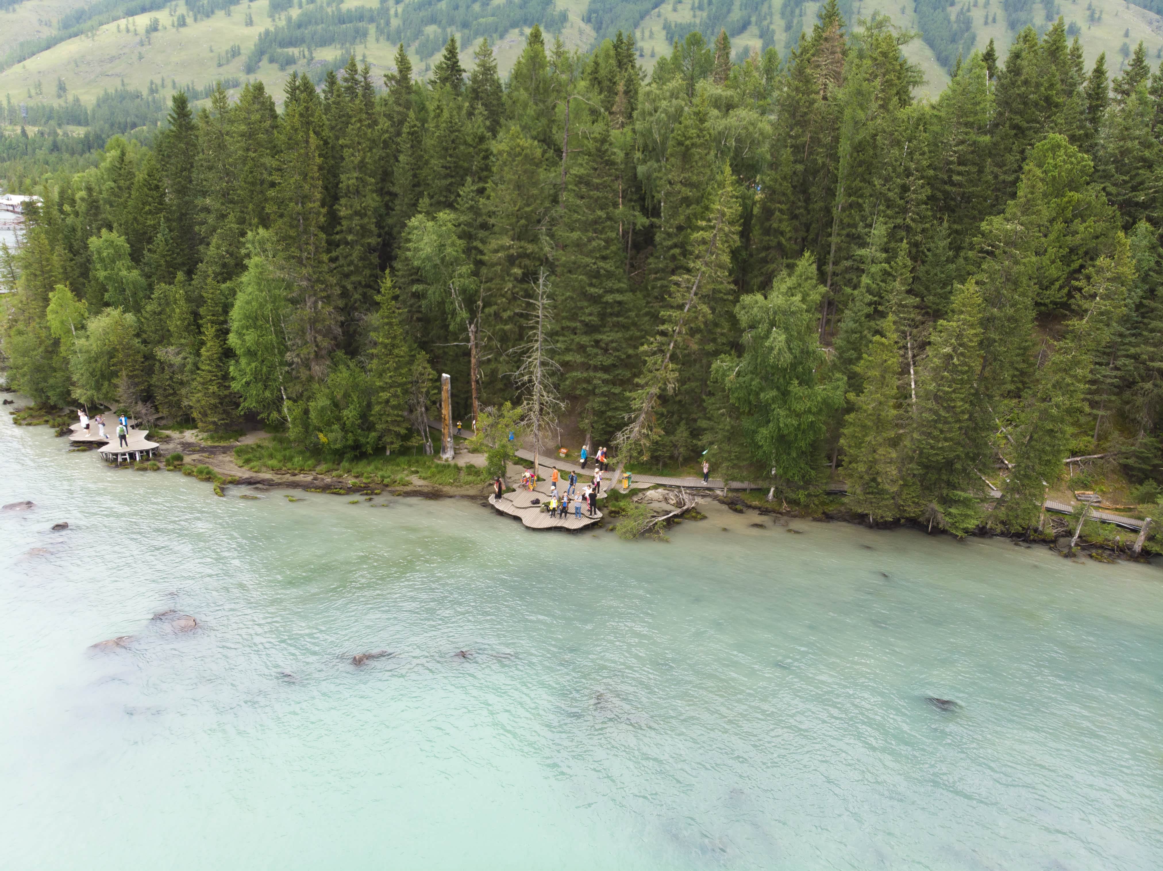 透过车窗拍的神仙湾,真的还有一些仙气在月亮湾飞了一把之后就沿着栈道而下,近距离欣赏喀纳斯河的美景。