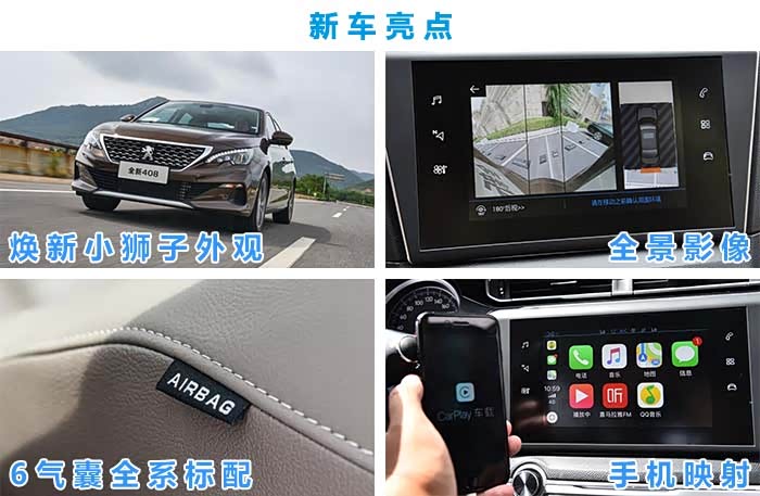 本次中期改款的东风标致408外观更年轻有型,9.7英寸中控屏配备了Blue-i车载互联系统,内置CarPlay手机映射、导航、通讯、违章查询等功能。新车全系标配6个气囊,同级别罕有,必须要点赞,还新增了全景影像功能,但画质稍差。此外,改款408不但配备了EBD电子制动力分配、ASR驱动防滑、VDC车身稳定系统、RMI侧翻干预系统,胎压监测也是全系标配。