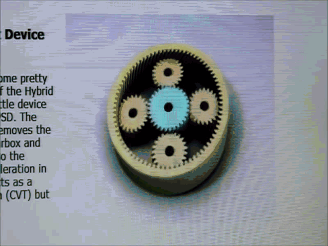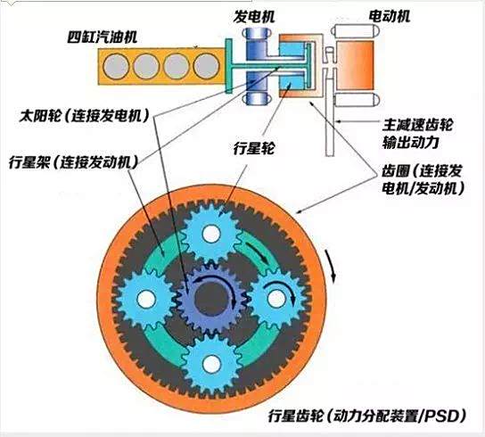 当行星们顺时针正转时,太阳也可以反转。反之,而当行星反转时,太阳又可以正转,从而实现车辆的前进和后腿;当行星们和太阳同向转动时,行星齿轮可以不自转,只公转,从而带动汽油机启动。正是因为行星齿轮组的这个巧妙的特性,发动机、车轮、电动机才能时时连接在一起运转而又能互不干扰,故此省去了离合的结构。