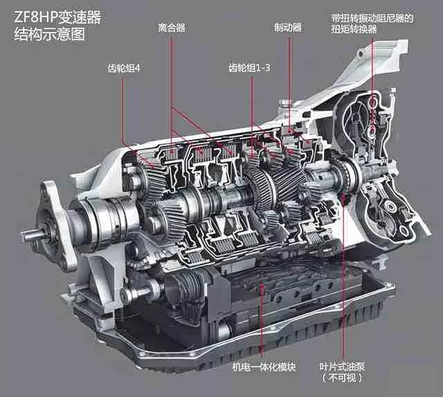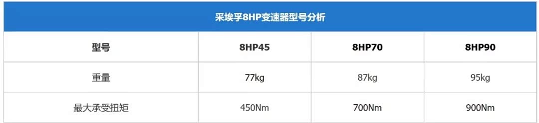 采埃孚8HP变速器的开发主旨其实并非一味增加档位,而是要降低油耗。从上图中我们可以看出,8HP具有四个齿轮组,总共只有5个换挡部件:3个多篇离合器以及两个制动器。并不复杂的结构使其具有重量轻、换挡迅速以及能承受高扭矩的特点。采埃孚8HP目前有三种型号,分别为8HP45、8HP70和8HP90。从型号名上就可以看出它们所对应的最大扭矩: