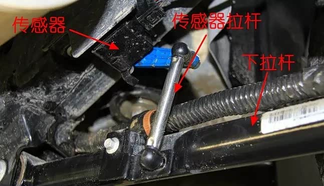 H9还有大灯自动调整功能,其车身俯仰角度信号的输入来自于后桥上的位置传感器。比如车子停在下坡路面,重心前移导致车尾上抬,下拉杆与大梁之间的夹角变大。夹角的变化被“传感器拉杆”传递到"传感器“,于是传感器就能给出相应的信号,使大灯能够正确的调整照射角度的高低。