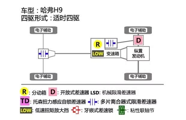 在逻辑标定上,H9被归纳为适时四驱,即在地形选择系统中的自动(auto)模式下,这套四驱系统为适时四驱。如果选择低速四驱,分动箱同样会压紧多片离合器,在扭矩范围内实现前后轴硬连接接。所以,利用TOD实现的四驱,再用传统的分时四驱,适时四驱或者全时四驱去定义,就有些不是那么合适。就好像超选四驱,想怎么玩都行。不如我们叫这类四驱为智能四驱系统吧。