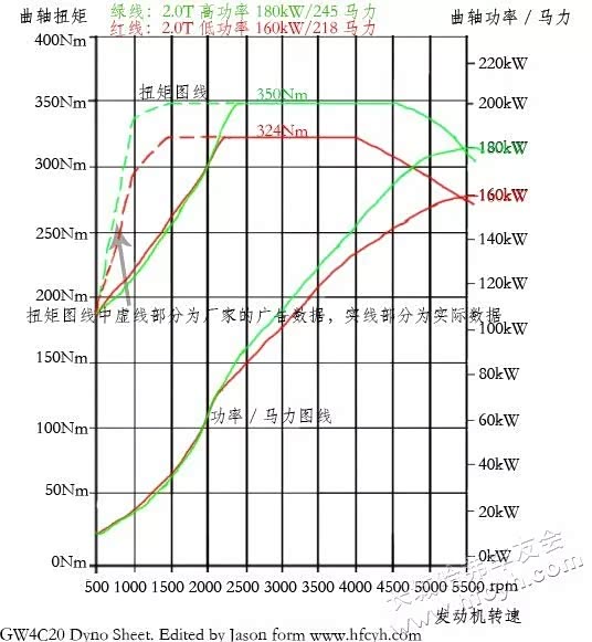 汽油机型号为4C20A汽油高功率发动机,作为4C20系列的高阶版本,采用了缸内直喷、双流道增压器、双VVT、双侧置平衡轴等技术。最大功率为185Kw,在1800-4500rpm的宽泛转速区间均可对应355N•m峰值扭矩输出。拜此加持,让大块头H9也有着10.8秒的百公里加速水平。汽车之家的实测百公里加速为9.53s,官方的数据看来有些偏保守了。官方没有给出发动机动力输出曲线,下图是JASONBORA做的长城GW4C20和4C20A的功率输出图。JASON以自己对涡轮增压的理解,相当“理中客”的保守估计了4C20系列的性能:2200转出最大扭矩,保持到4000~4500转,功率要到5500转才达到顶峰。至于JASONBORA的测试结果,本文不做评论,这张图也有原厂的曲线(虚线部分),供大家参考。