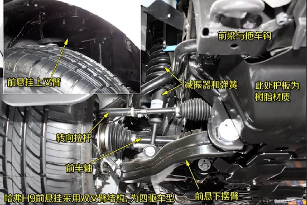 H9的前悬挂是双A臂+螺旋弹簧的独立悬架系统,后悬为螺旋弹簧+硬桥+五连杆结构。这个悬挂组合是目前硬派越野车型中最常见的组合,但H9对这套悬挂还是做了自己独特的设计。H9悬挂的特点是行程特别长。行程从哪里来,从轮距来。