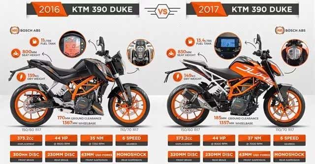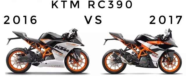 相比390duke的造型大改,rc390只能说是小改款:1.2017款的RC 390外观最大的变化则主要在排气管上,隐藏的排气变为了传统的边出排气筒,这也是为应对欧洲最新的排气法规做的改变。比较遗憾的是仪表并没有采用全彩的TFT仪表。2.新款发动机 - 采用了新的373.2cc(老款376.4cc)单缸水冷发动机,最大功率32kW(老款30kW),最大扭力36Nm(老款35Nm)。3.更大的前碟刹盘 - 2017 KTM RC390采用了更大的320mm前碟刹盘。 可以提供更好的制动力,并用铝制成,确保了更轻的重量,以及更好的散热。