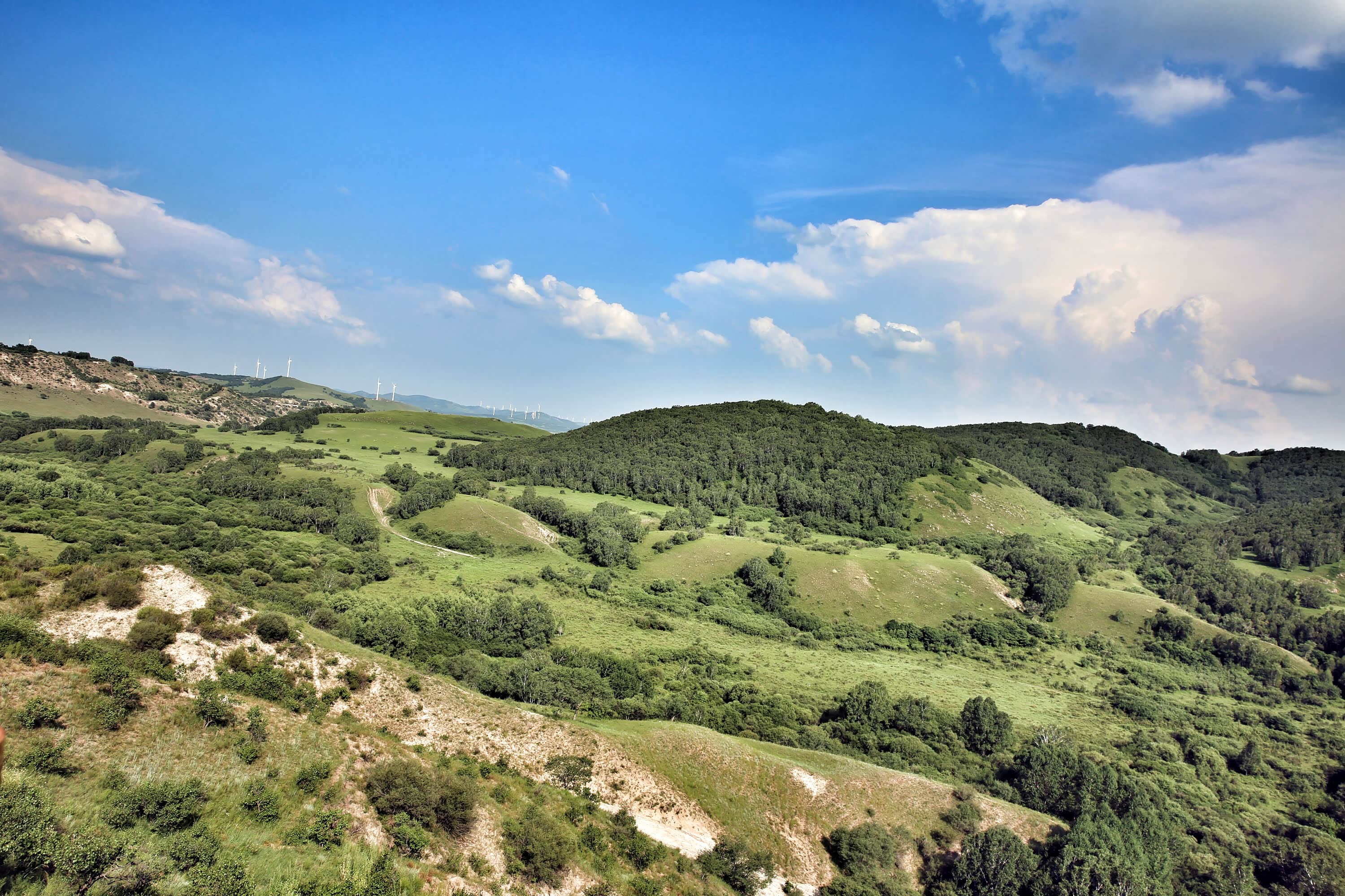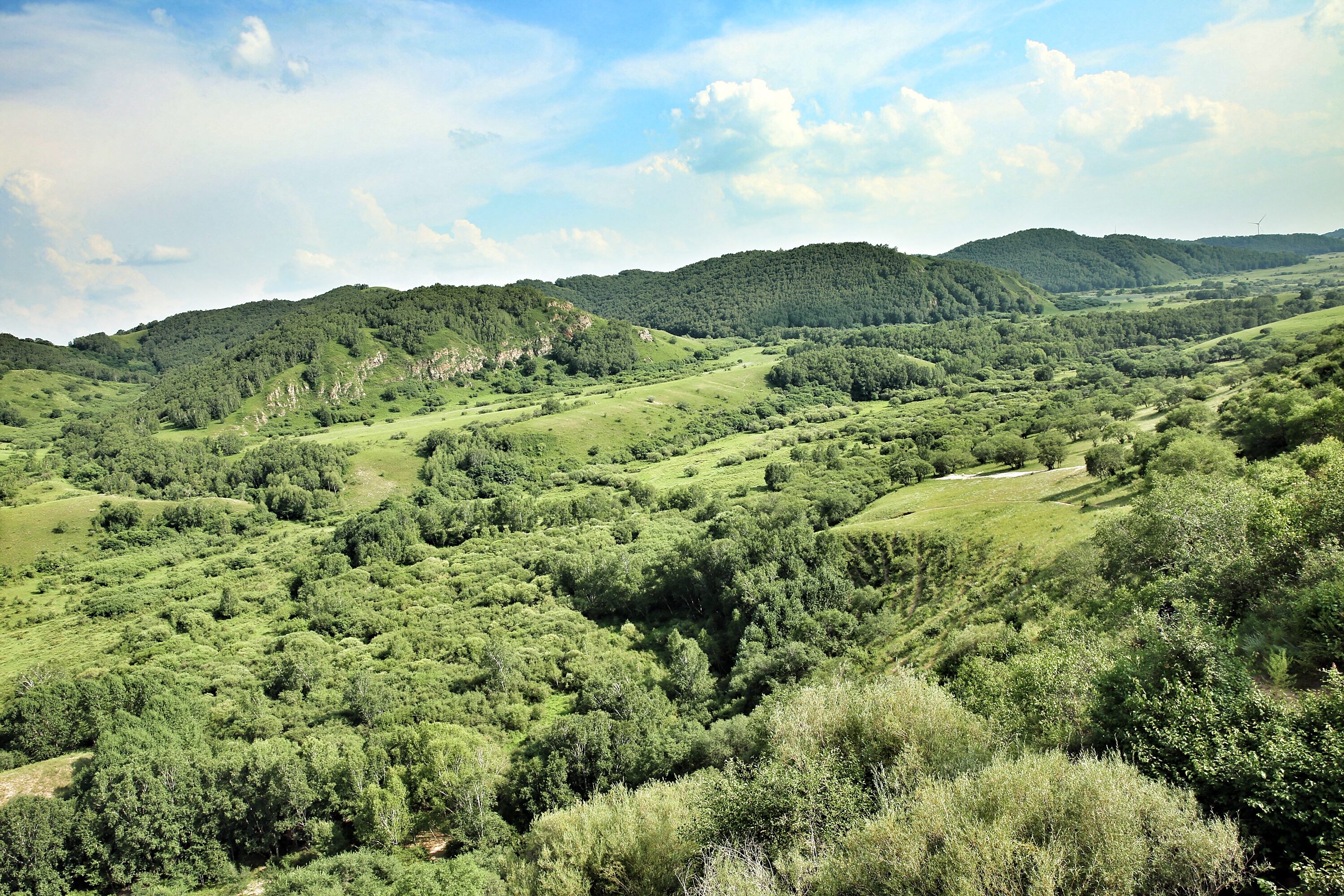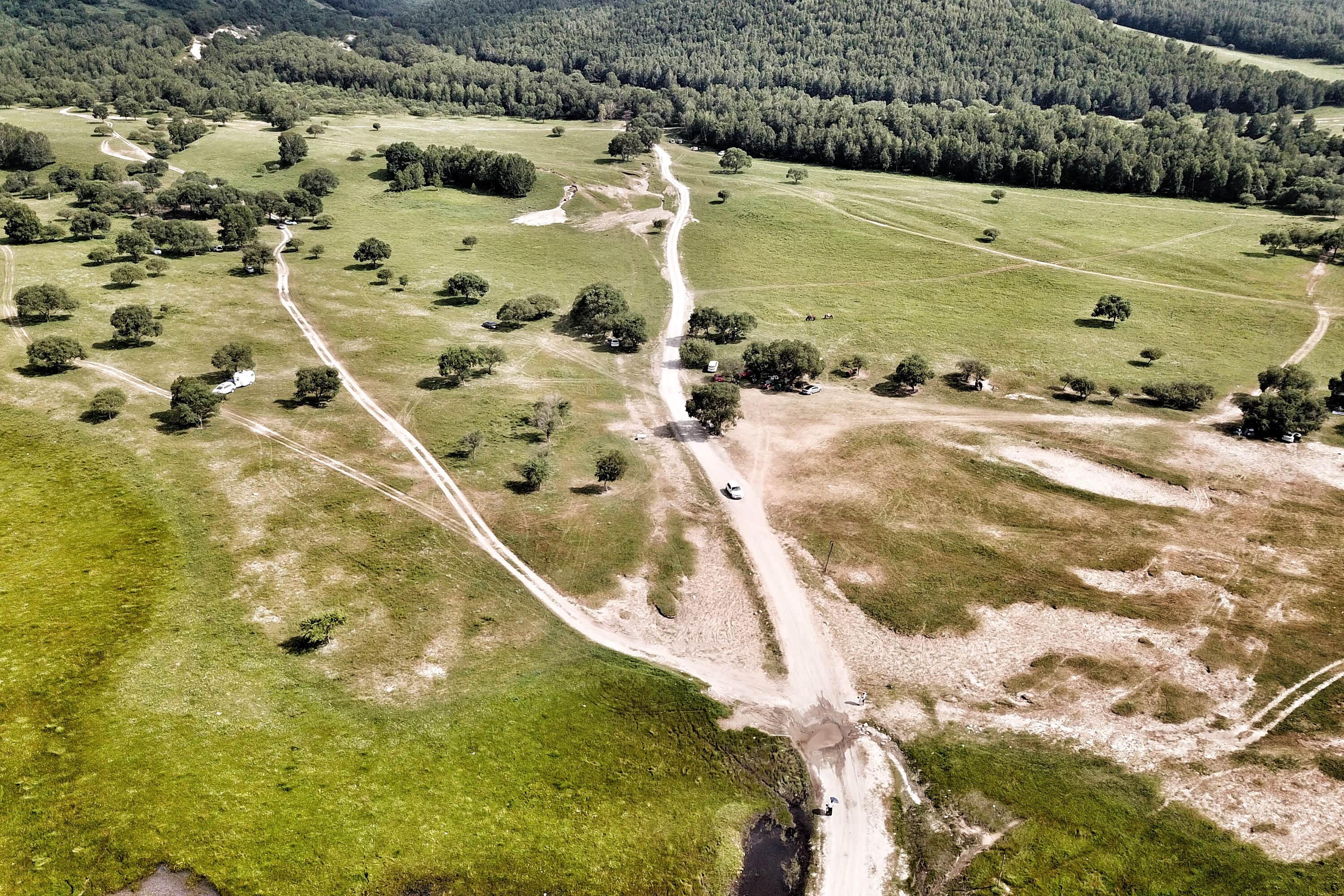 远离景区,无人机能够真正“放飞自我”。草原视野极佳,再加上森林和丘陵带来的层次感,构图的余地也变得比较大。顺便一提,草原林地夏季偶有阵雨,遇到侧风应当注意无人机安全。