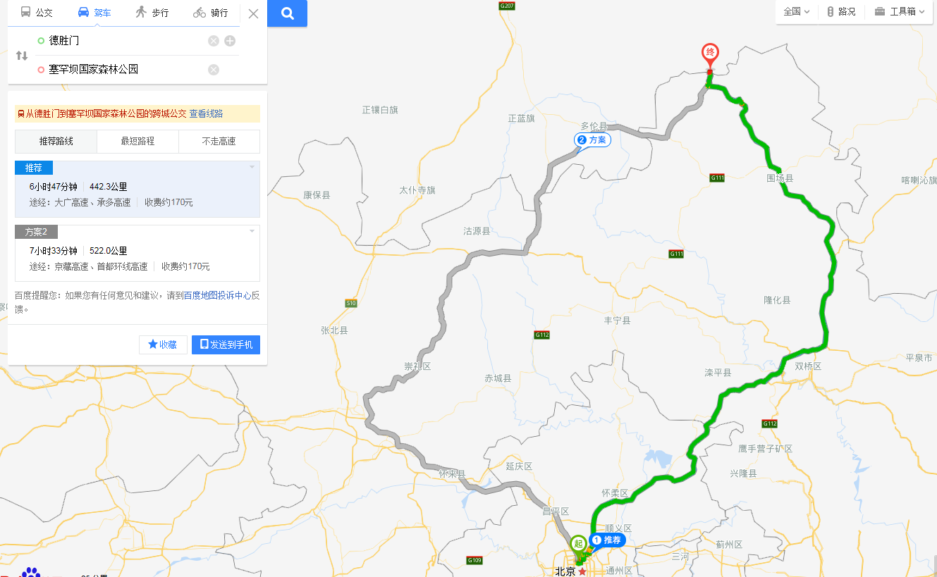 从北京市区出发到塞罕坝景区,驾车总里程在450公里左右。路线大致是G45京承(大广)高速,途径承德市区,转S50承围高速,下高速后走国道/县道约80公里,全程用时6至7小时。为什么是是一个时间范围呢?因为堵车情况属于未知。周六早上,京承高速出京方向往往比较拥堵,如果出门不够早,堵车是避免不了的。
