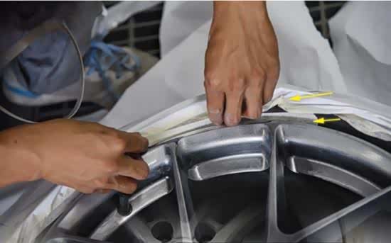 和车漆喷漆一样,轮毂喷漆前也需要进行遮蔽,轮毂遮蔽需要用到美纹纸和遮蔽纸。关于遮蔽的作用想必大家都明白,就是防止油漆喷到轮胎或其它地方。其实,这和我们去理发店理发时要带一个围裙是一个道理。
