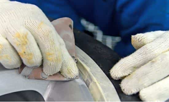 和车漆打磨是一个道理,修补轮毂首先要把破损处的毛刺进行磨平,这样是为了方便下一道工序“刮腻子”而准备的。根据轮毂创面的大小,打磨轮毂毛刺可以使用特殊的角磨机或者是砂纸进行打磨,当然,无论如何,目的只有一个,就是将毛刺打磨平整为止。