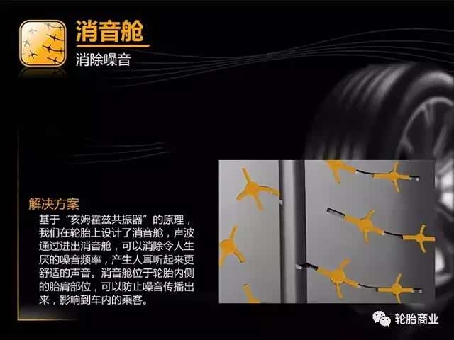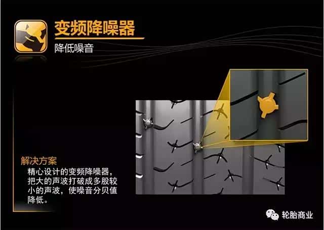 基于“赫姆霍兹共振器”的原理,在轮胎上设计了消音舱,声波通过进出消音舱,可以消除令人生厌的噪音频率,产生人耳听起来更舒适的声音。消音舱位于轮胎内侧的胎肩部位,可以防止噪音传出来,影响车内乘客。而变频降噪器则是把大的声波打破成多股较小的声波,使噪音分贝值降低。