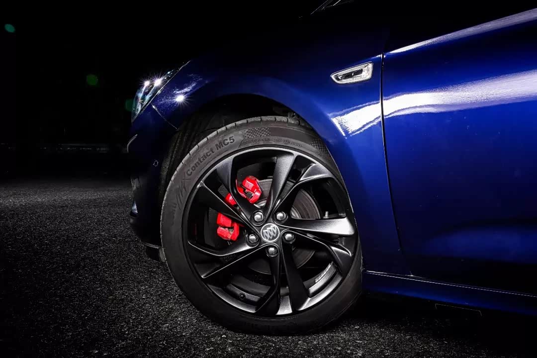 正如前面所说,威朗GS的内、外观充满运动元素,中网飞翼式镀铬饰条旁硕大的“GS”字样表示它在车系中的地位,造型张扬的前保险杠下方以一条象征着热血的红线点缀,车尾也做出了双边排气和扩散器的样式,搭配马牌MC5轮胎的17寸暗黑风火轮和下面的红色刹车卡钳同样引人注目。